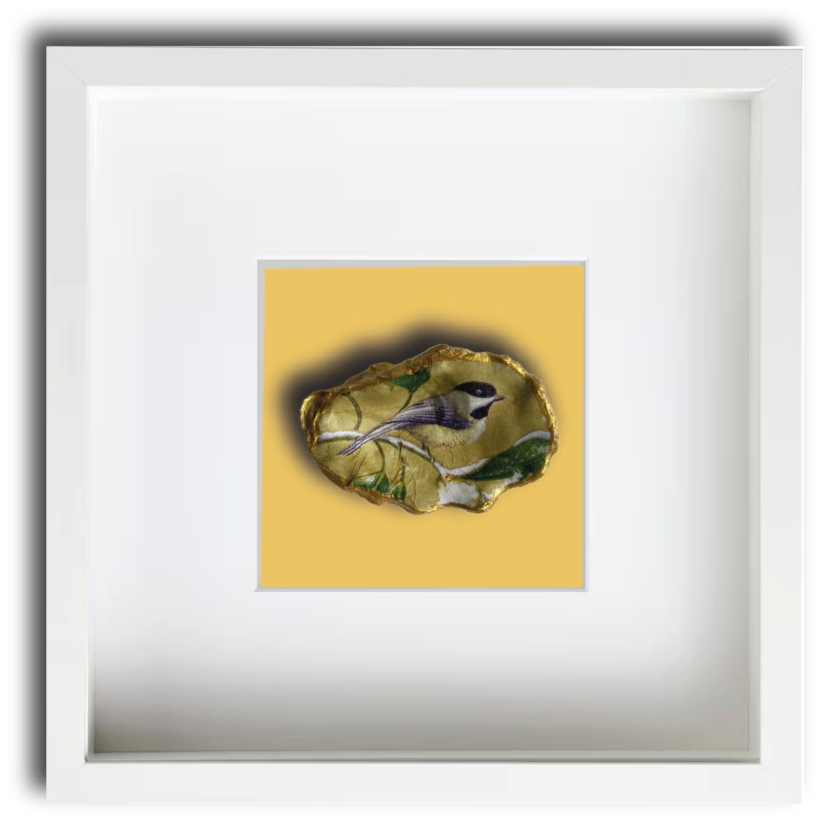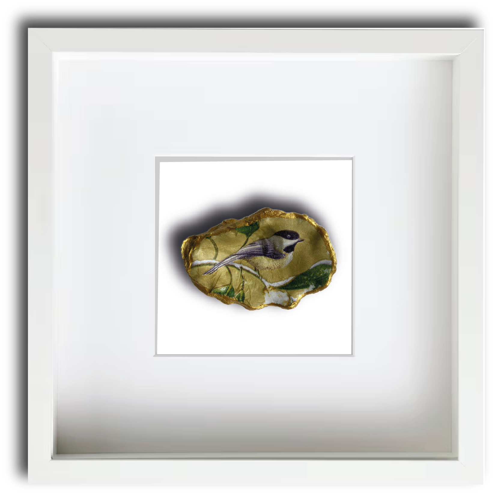 Deze Japanse oesterschelp hebben we geraapt in de Oosterschelde. Om de natuurlijke vormen te accentueren hebben we de buitenkant en de randen van de schelp met goudverf beschilderd. Als afbeelding hebben we de Chickadee of Amerikaanse Matkop gebruikt. Dit is de meest verbreide mees in Noord-Amerika. Mooi om naar te kijken en leuk als cadeau om te geven.