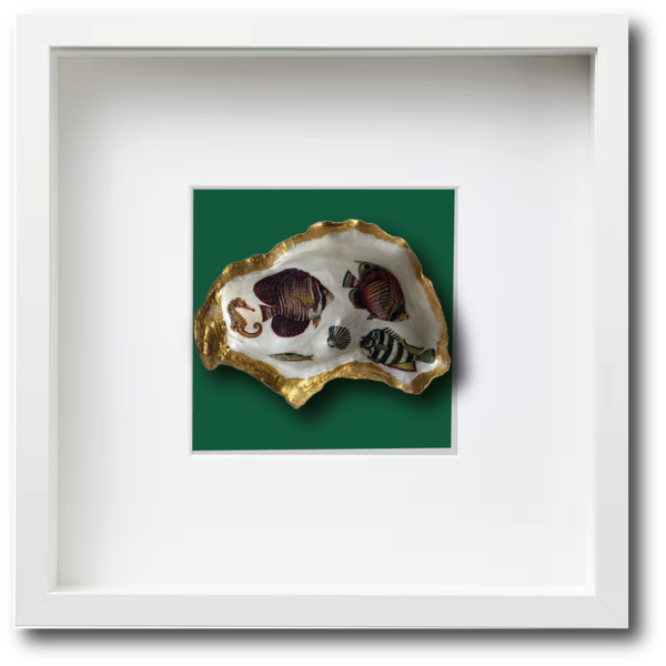 Deze grote met de hand gedecoreerde XL oesterschelp is geplukt in de Oosterschelde. Om de natuurlijke vormen van de oesterschelp te benadrukken hebben we de buitenkant en de rand beschilderd met goudverf. Als afbeelding hebben we een kleurrijke visjes gebruikt. Leuk en decoratief te gebruiken op tafel of in een schilderijlijst.