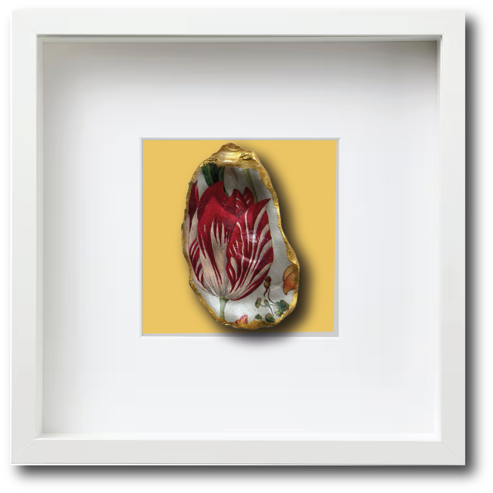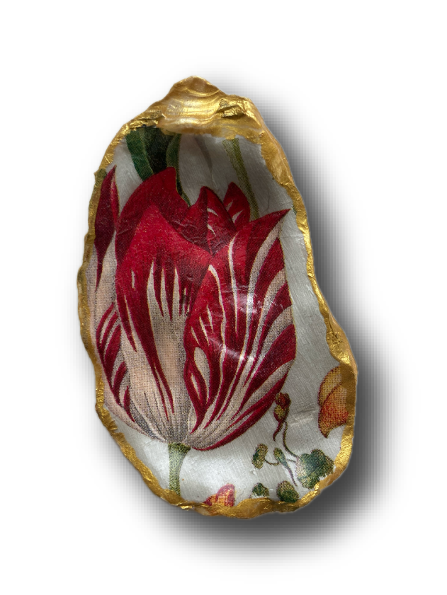 Deze mooie rode tulp hebben we aangebracht op een grote oesterschelp. De achterzijde van de schelp en de randen zijn beschilderd met goudverf en vervolgens is de decoratie afgelakt. Een prachtige decoratie in je woonkamer.