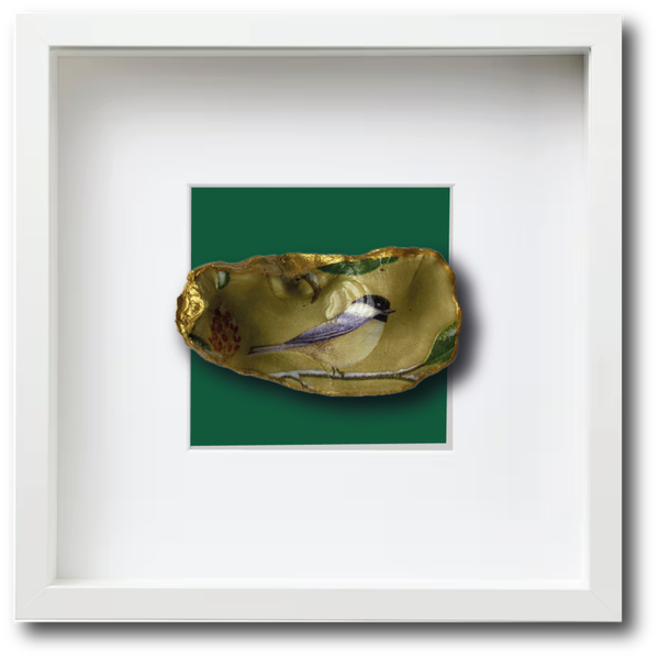 Deze Japanse oesterschelp hebben we geraapt in de Oosterschelde. Om de natuurlijke vormen te accentueren hebben we de buitenkant en de randen van de schelp met goudverf beschilderd. Als afbeelding hebben we de Chickadee of Amerikaanse Matkop gebruikt. Dit is de meest verbreide mees in Noord-Amerika. Mooi om naar te kijken als los exemplaar of in een schilderijlijst.