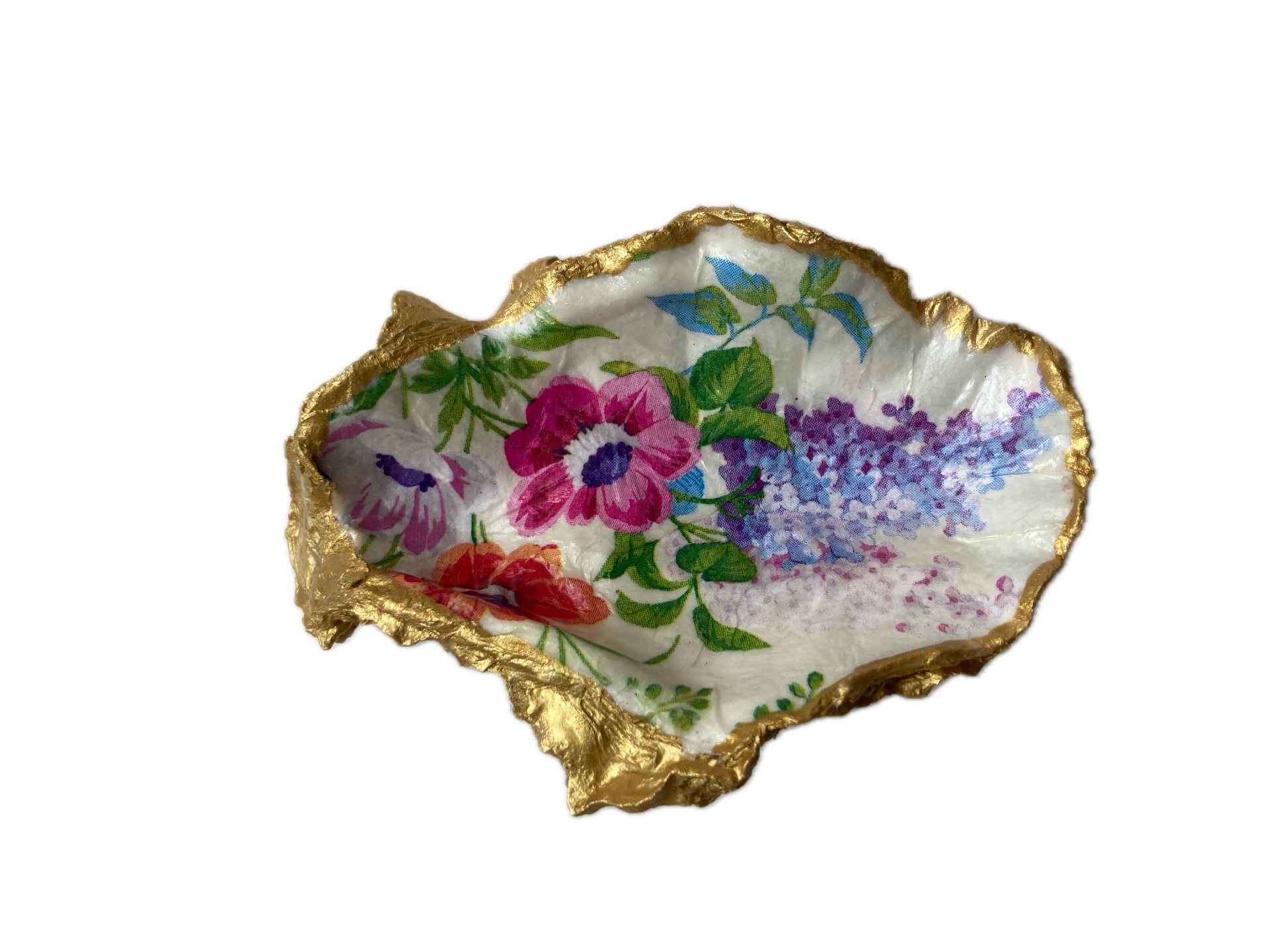 Dit is een grote oesterschelp die wij een tweede leven geven door het te decoreren, zodat het een mooi decoratief sieraad kan zijn in huis. De goudverf op de achterzijde en de randen accentueren de prachtige vormen van de oesterschelp.