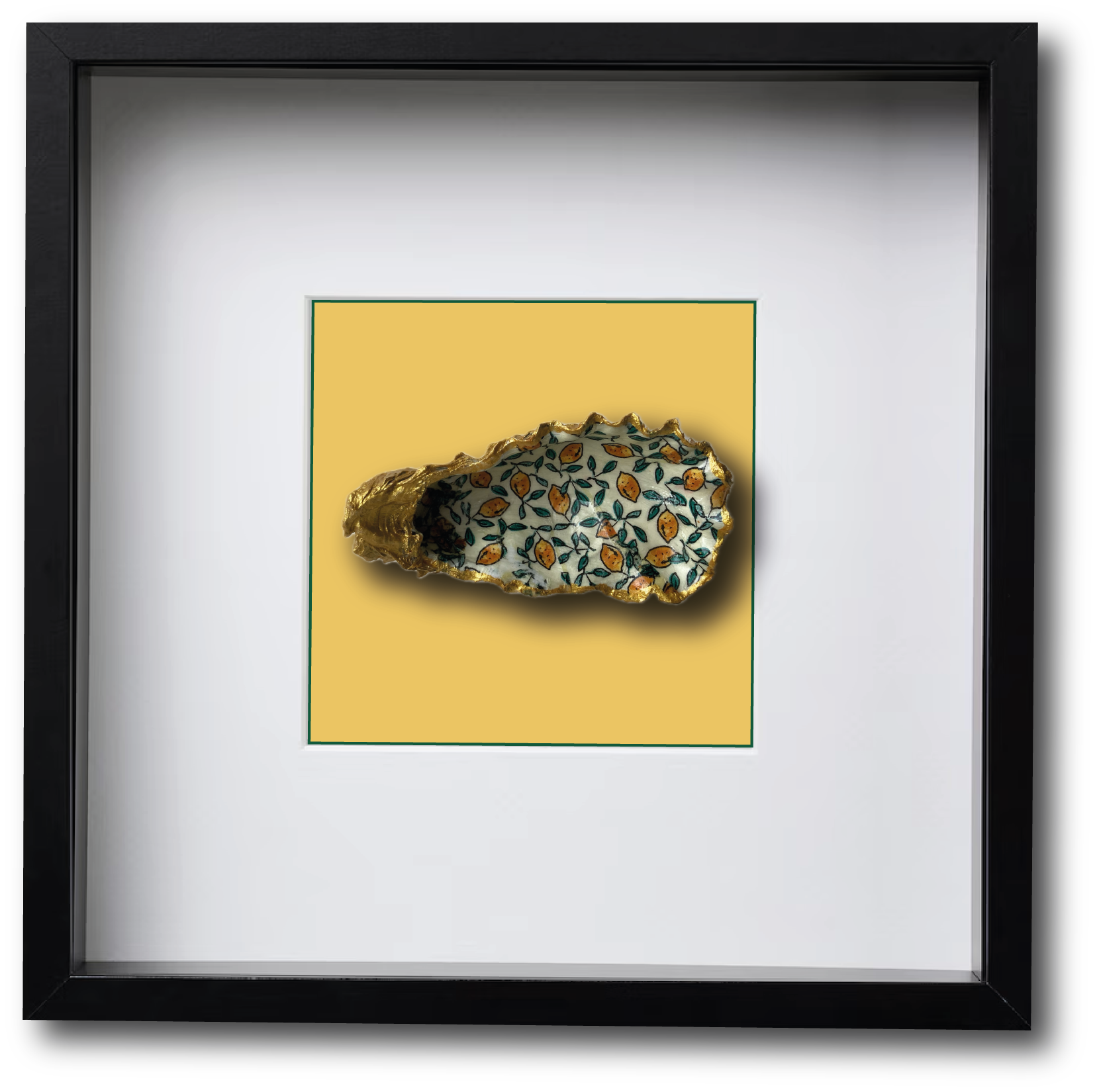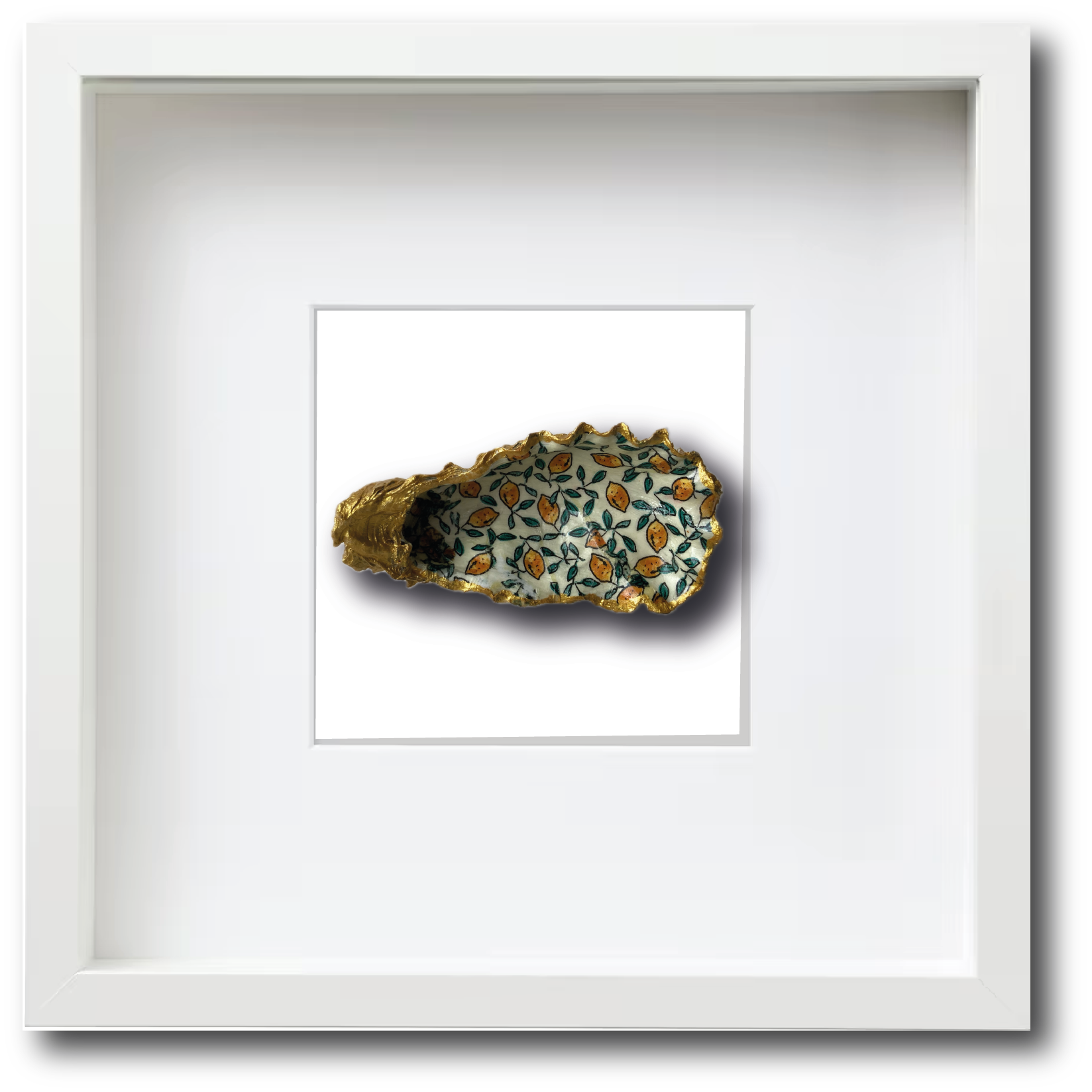 Deze Japanse oester hebben we geraapt in de Oosterschelde. Om de natuurlijke vormen van de oesterschelp te benadrukken hebben we de achterkant en de randen met goudverf beschilderd. Op de binnenzijde van de oesterschelp hebben we een leuke afbeelding met citroentjes geplaatst. Een leuke cadeautip.
