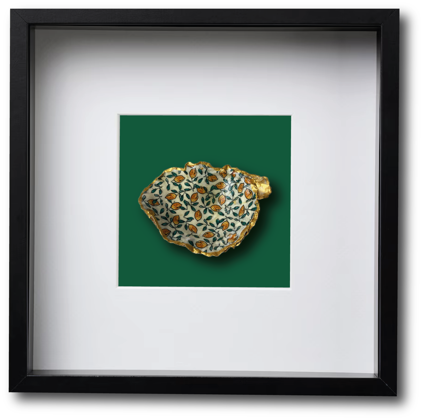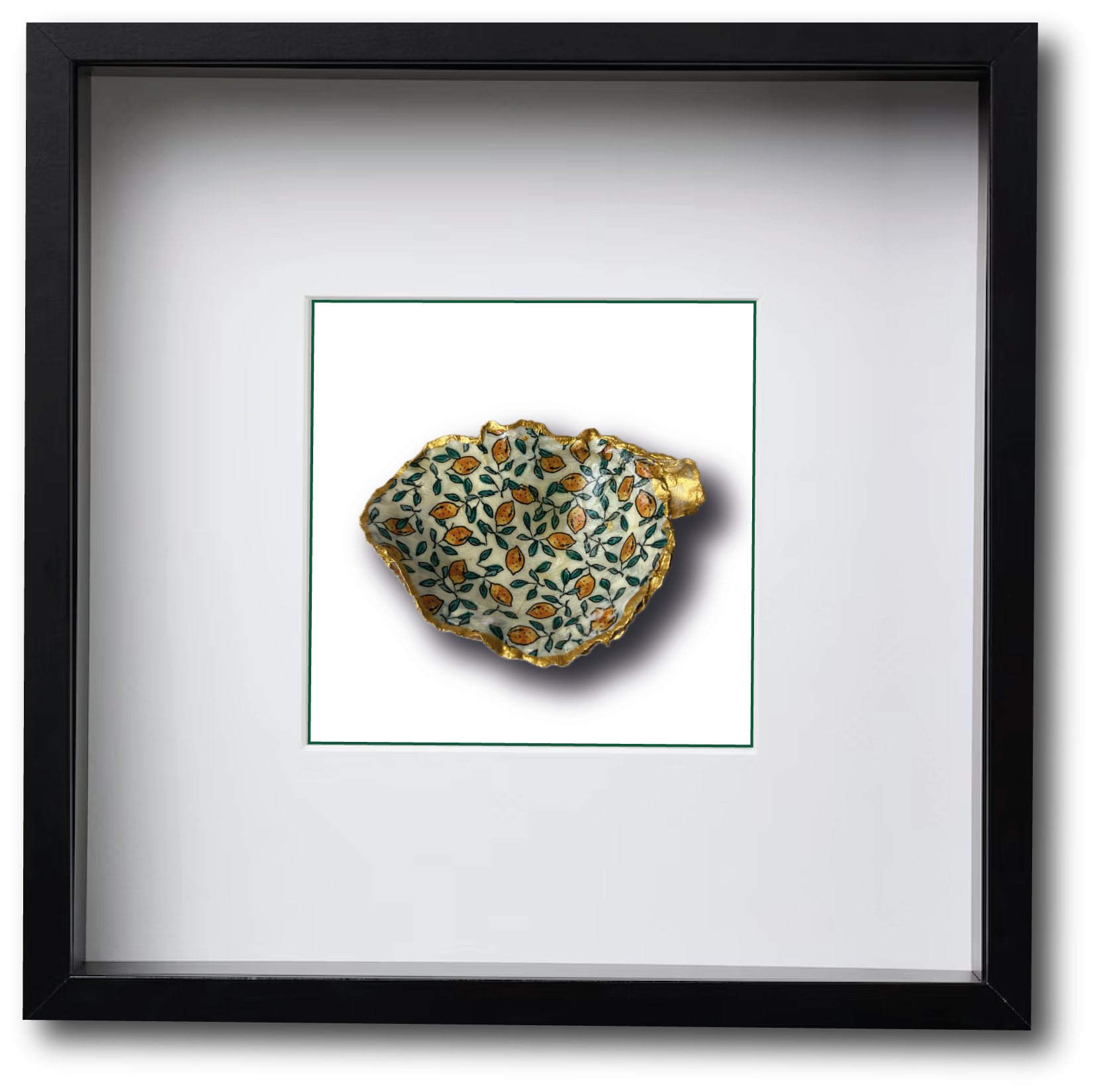 Deze Japanse oester hebben we geraapt in de Oosterschelde. Om de natuurlijke vormen van de oesterschelp te benadrukken hebben we de achterkant en de randen met goudverf beschilderd. Op de binnenzijde van de oesterschelp hebben we een leuke afbeelding met citroentjes geplaatst. Een leuk item op tafel voor een mooi diner.