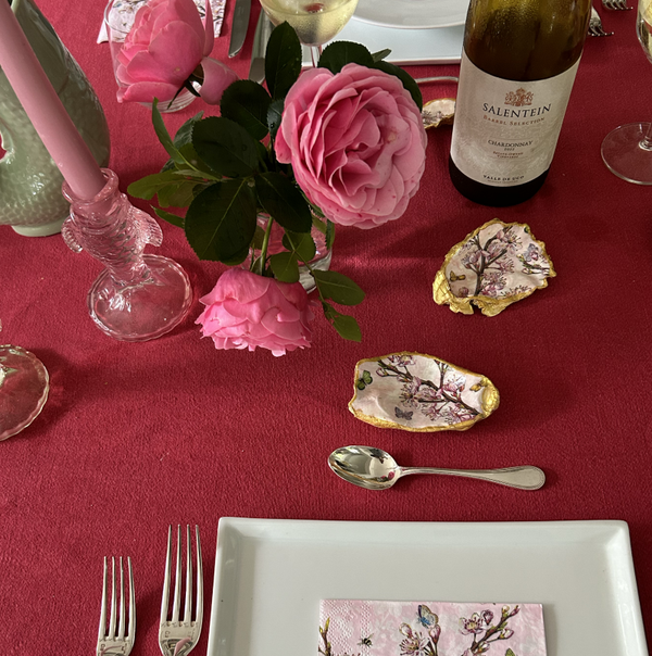De roze bloesem op deze oesterschelp brengt de lente in de huiskamer. De met de hand gedecoreerde oesterschelp is beschilderd met goudverf om de vormen van de oesterschelp extra te accentueren.