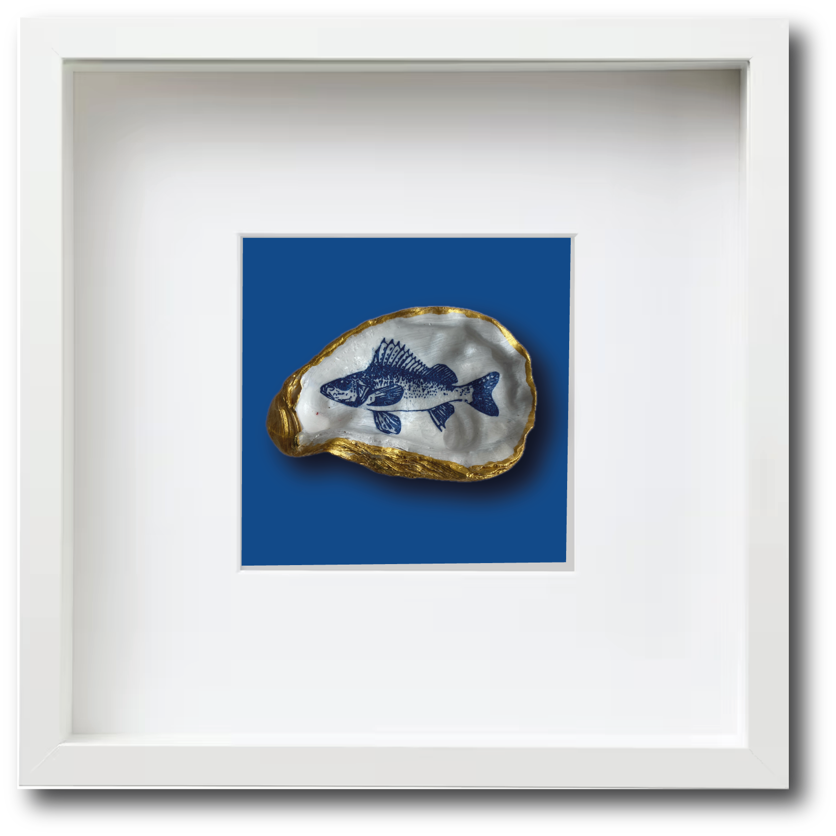 Deze met de hand gedecoreerde oesterschelp is geplukt in de Oosterschelde. Om de natuurlijke vormen van de oesterschelp te benadrukken hebben we de buitenkant en de rand beschilderd met goudverf. Als afbeelding hebben we een pos (familie van de snoekbaars) gebruikt in Delfts blauw.