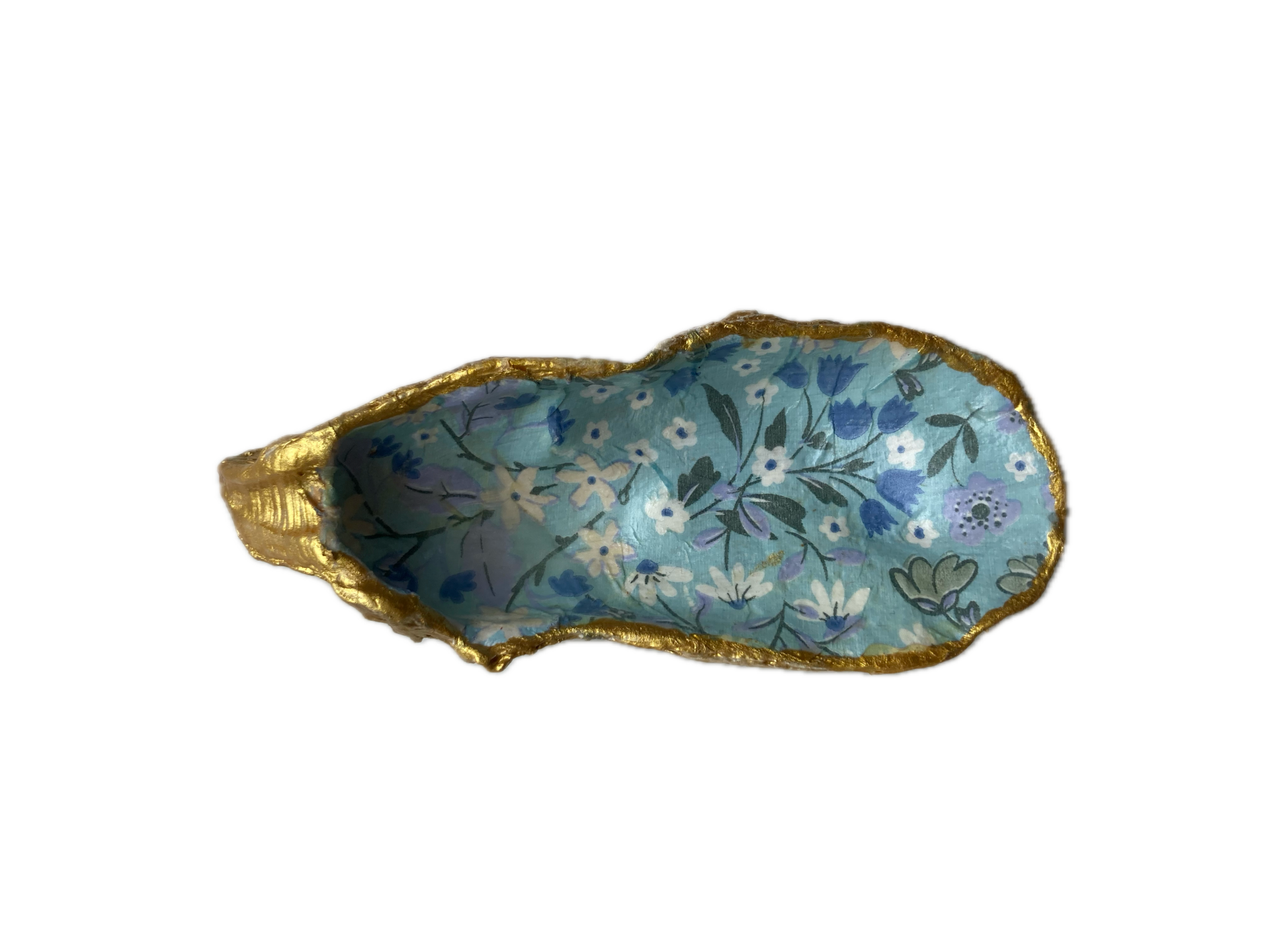 Deze Japanse oester hebben we geraapt in de Oosterschelde. Om de natuurlijke vormen van de oesterschelp te benadrukken hebben we de achterkant en de randen met goudverf beschilderd. Op de binnenzijde van de oesterschelp hebben we een leuke afbeelding met blauwe bloemetjes geplaatst. Een leuk en origineel cadeau.