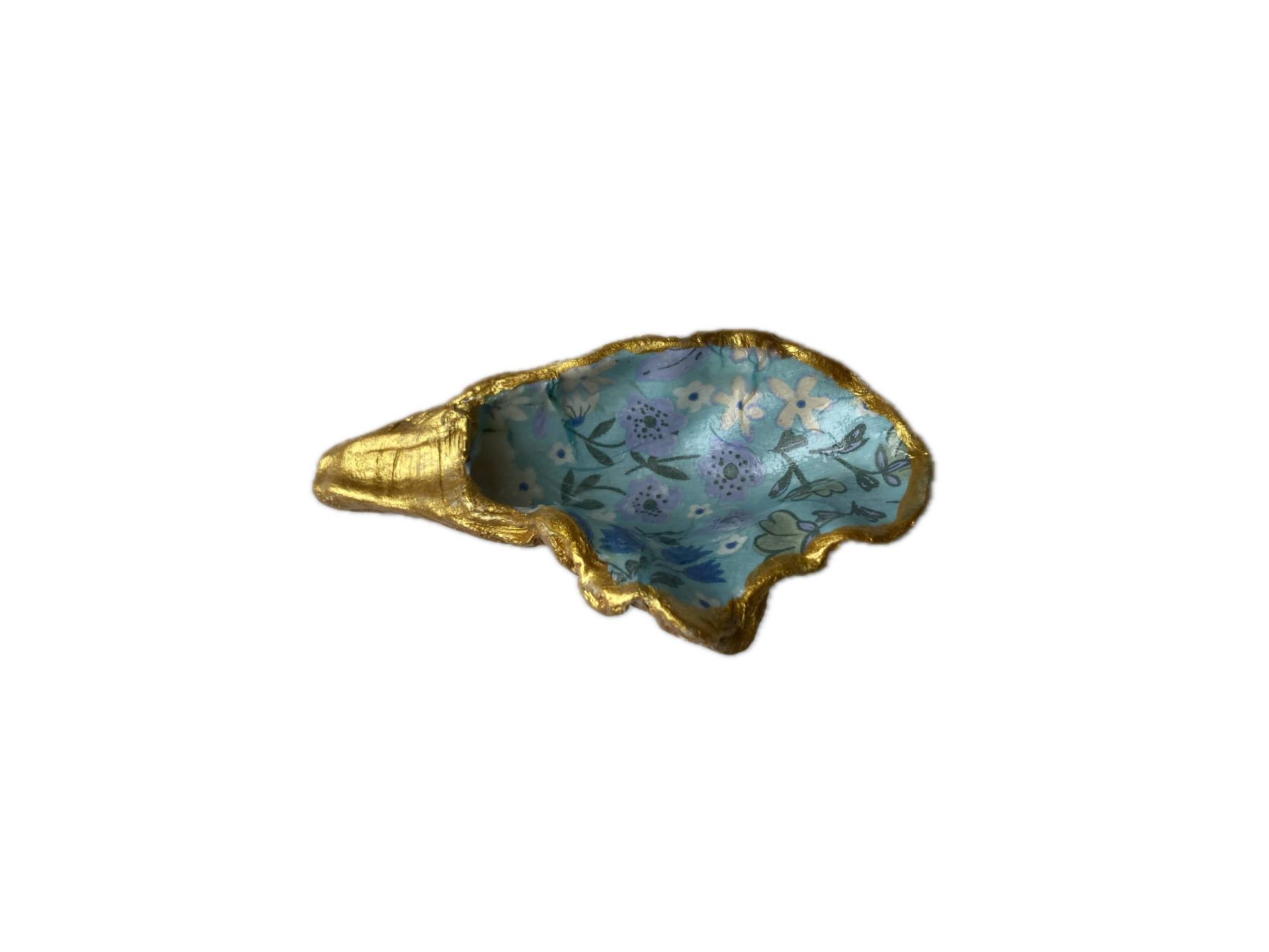 Deze Japanse oester hebben we geraapt in de Oosterschelde. Om de natuurlijke vormen van de oesterschelp te benadrukken hebben we de achterkant en de randen met goudverf beschilderd. Op de binnenzijde van de oesterschelp hebben we een leuke afbeelding met blauwe bloemetjes geplaatst. Een leuk en origineel cadeau.