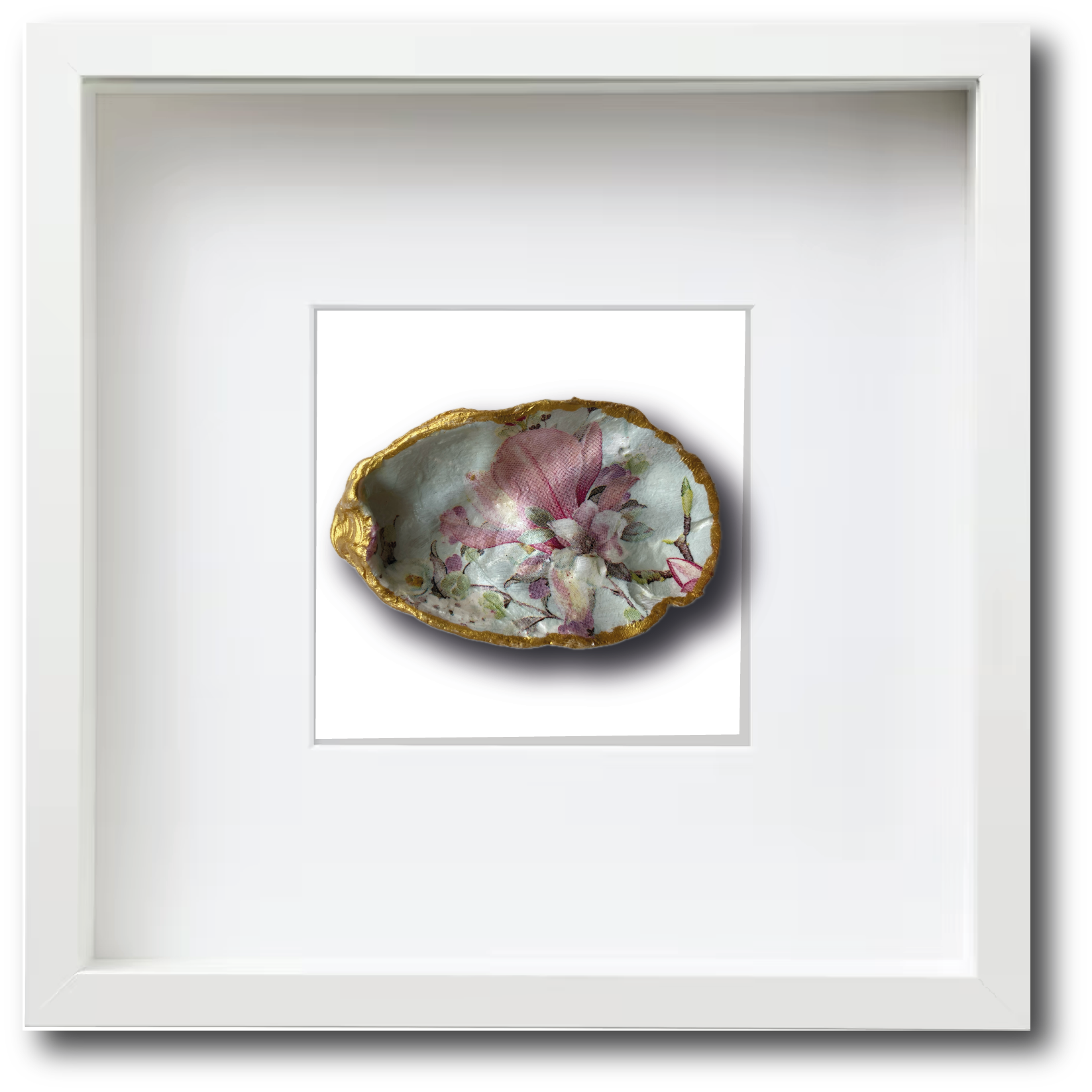 Deze oesterschelp komt ook uit de Oosterschelde. Wij hebben hem schoongemaakt en beschilderd met goudverf om de prachtige vormen te accentueren. Als decoratie hebben we gekozen voor een mooie romantische magnoliabloem.