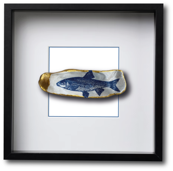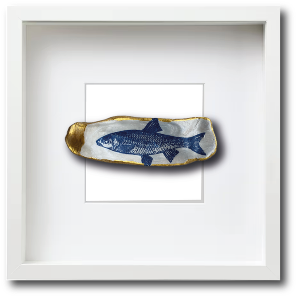 Deze met de hand gedecoreerde oesterschelp is geplukt in de Oosterschelde. Om de natuurlijke vormen van de oesterschelp te benadrukken hebben we de buitenkant en de rand beschilderd met goudverf. Als afbeelding hebben we een Delfts blauw vogeltje gebruikt.