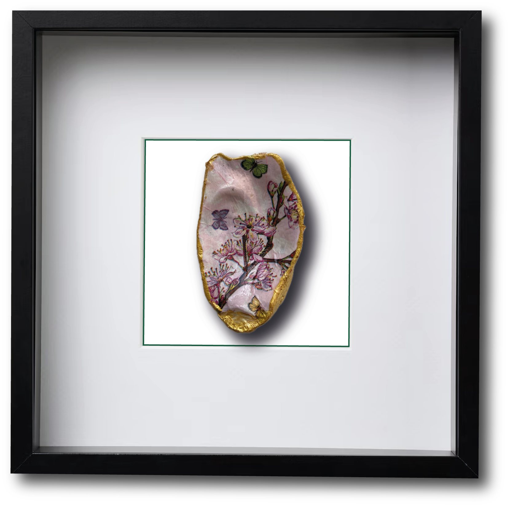 De roze bloesem op deze oesterschelp brengt de lente in de woonkamer. De met de hand gedecoreerde oesterschelp is beschilderd met goudverf om de vormen van de oesterschelp extra te accentueren.
