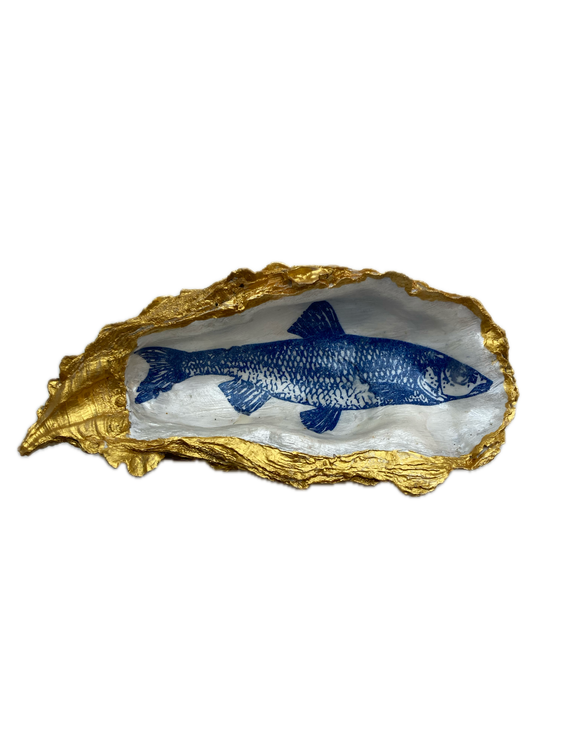 Deze met de hand gedecoreerde oesterschelp is geplukt in de Oosterschelde. Om de natuurlijke vormen van de oesterschelp te benadrukken hebben we de buitenkant en de rand beschilderd met goudverf. Als afbeelding hebben we een karper gebruikt in Delfts blauw.