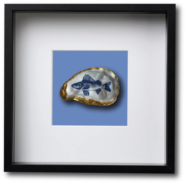 Deze met de hand gedecoreerde oesterschelp is geplukt in de Oosterschelde. Om de natuurlijke vormen van de oesterschelp te benadrukken hebben we de buitenkant en de rand beschilderd met goudverf. Als afbeelding hebben we een pos (familie van de snoekbaars) gebruikt in Delfts blauw.