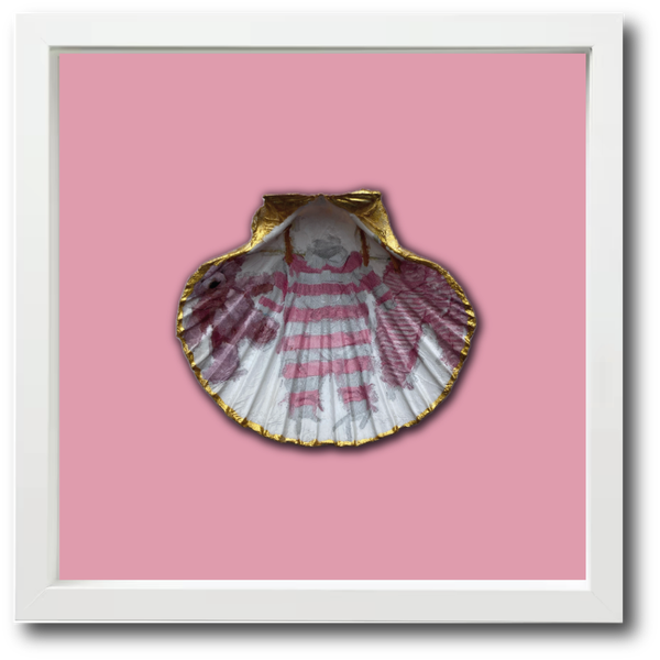 Deze St. Jacobsschelp hebben we gedecoreerd met een roze babykleertjes aan de waslijn. De achterzijde van de schelp en de randen zijn beschilderd met goudverf.