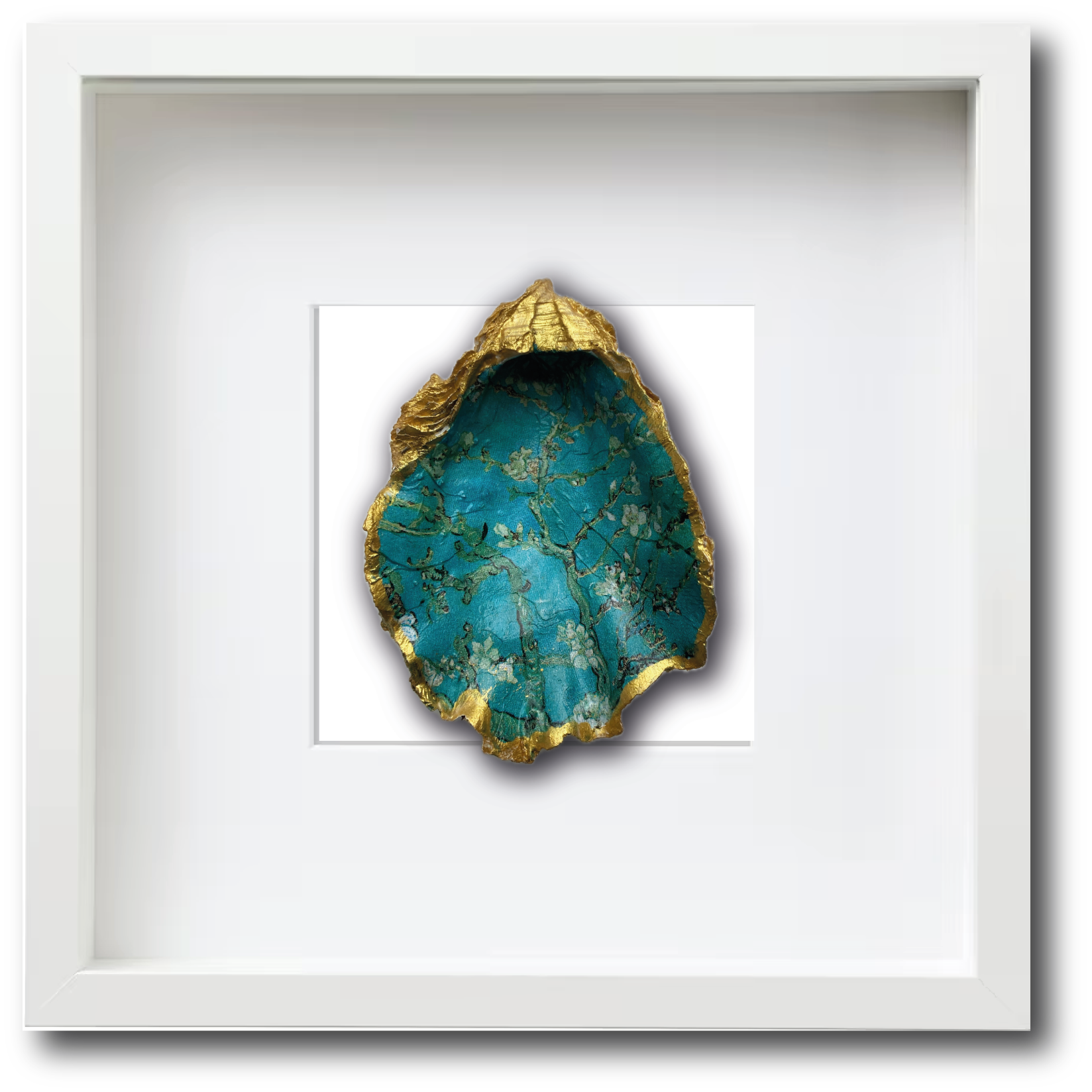 Deze XL oesterschelp hebben we geplukt in de Oosterschelde (in de buurt van Sas van Gent). We hebben hem gedecoreerd met een deel van de Amandelbloesem van Vincent van Gogh. Van Gogh schilderde dit als cadeau voor de geboorte van zijn neefje. Het is een van zijn lievelingsonderwerpen: grote bloeiende takken tegen een blauwe lucht. Te zien in het Van Gogh Museum in Amsterdam. Nu ook op een grote XLoesterschelp te koop en te bewonderen in je eigen woonkamer.