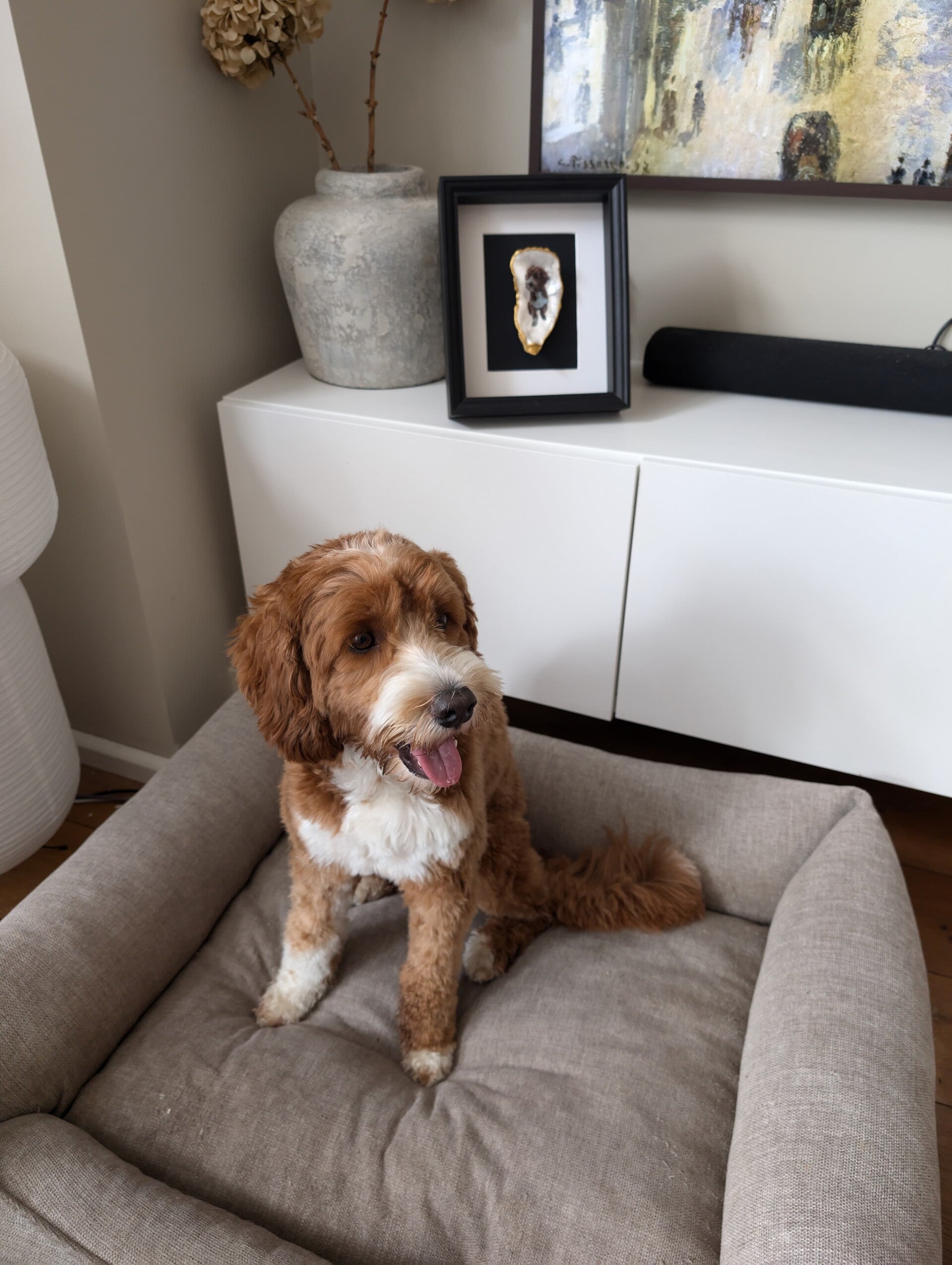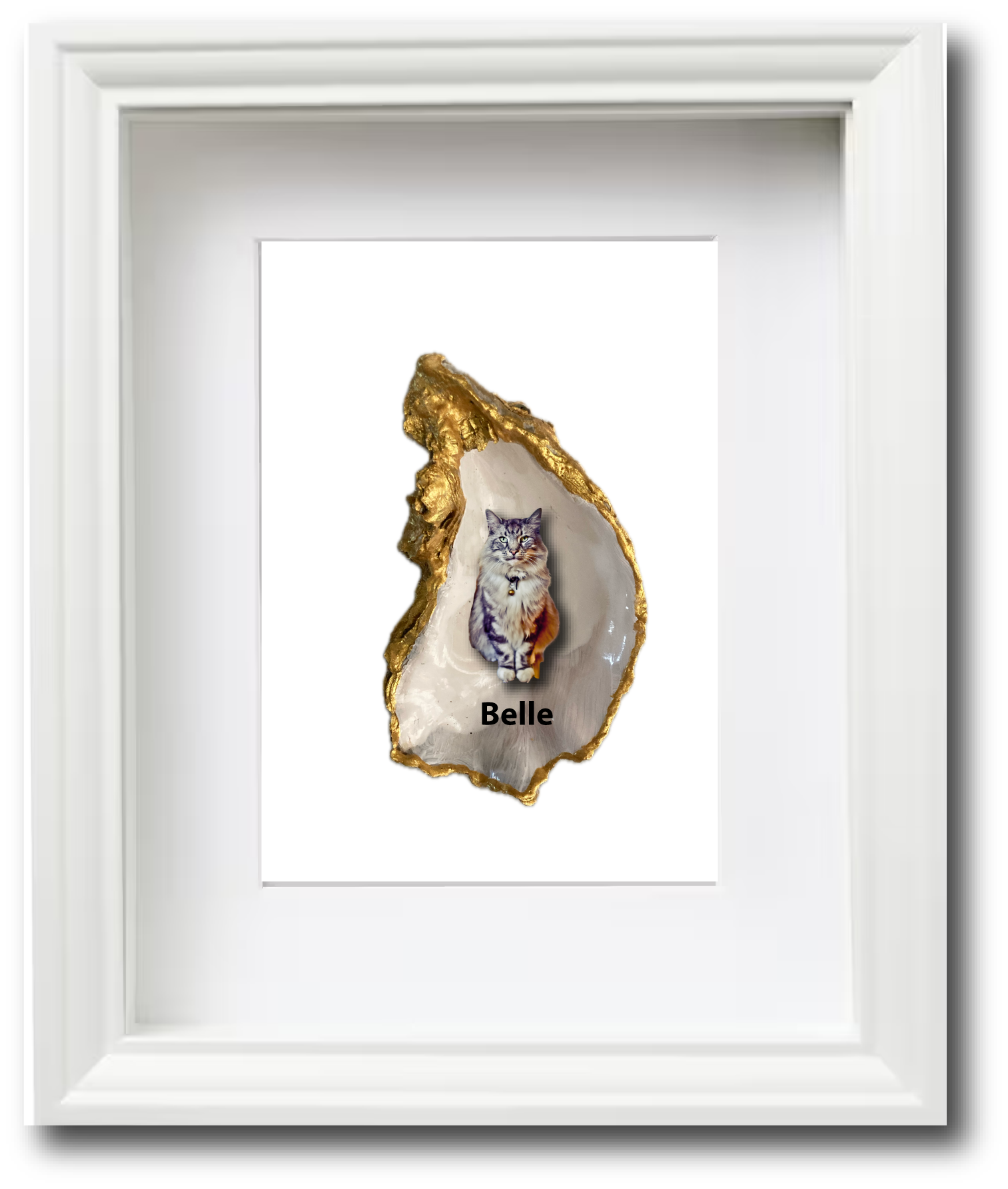 Je huisdier afgebeeld op een oesterschelp als origineel cadeautje om te geven. De oester als symbool voor een rijk en mooi leven. We hebben de buitenzijde beschilderd met goudverf en de natuurlijke vormen van de oesterschelp aan de binnenzijde geaccentueerd in goud. De binnenzijde van de oesterschelp is met witte parelmoer beschilderd, waarna we de afbeelding van je huisdier hebben aangebracht. Vervolgens wordt het geheel afgelakt met een transparante lak.