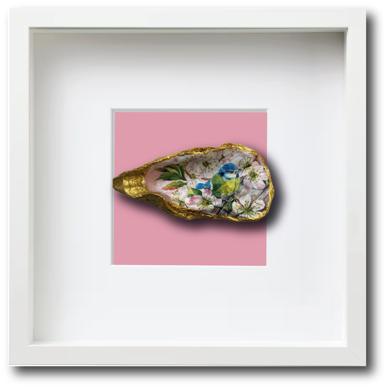 Deze Japanse oesterschelp hebben we geraapt in de Oosterschelde. Om de natuurlijke vormen te accentueren hebben we de buitenkant en de randen van de schelp met goudverf beschilderd. Als afbeelding hebben we de pimpelmees gebruikt, met zijn kenmerkende blauwe petje en gele borst. Mooi om naar te kijken als los exemplaar of in een schilderijlijst.