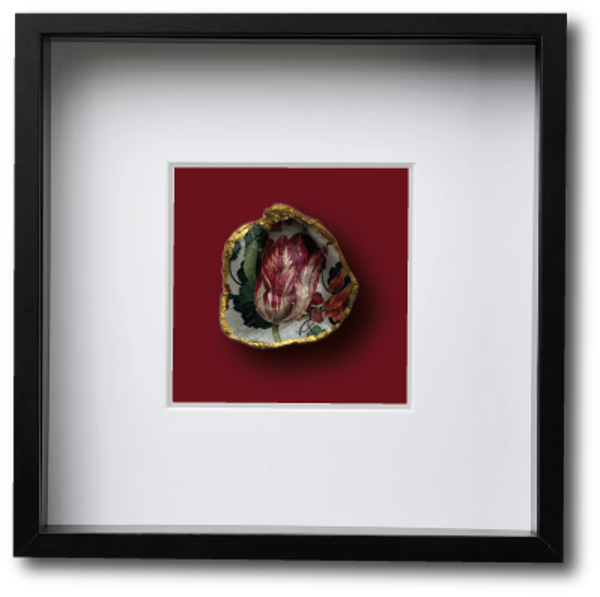 Deze mooie rode tulp hebben we aangebracht op een grote oesterschelp. De achterzijde van de schelp en de randen zijn beschilderd met goudverf en vervolgens is de decoratie afgelakt. Een prachtige decoratie in je woonkamer.