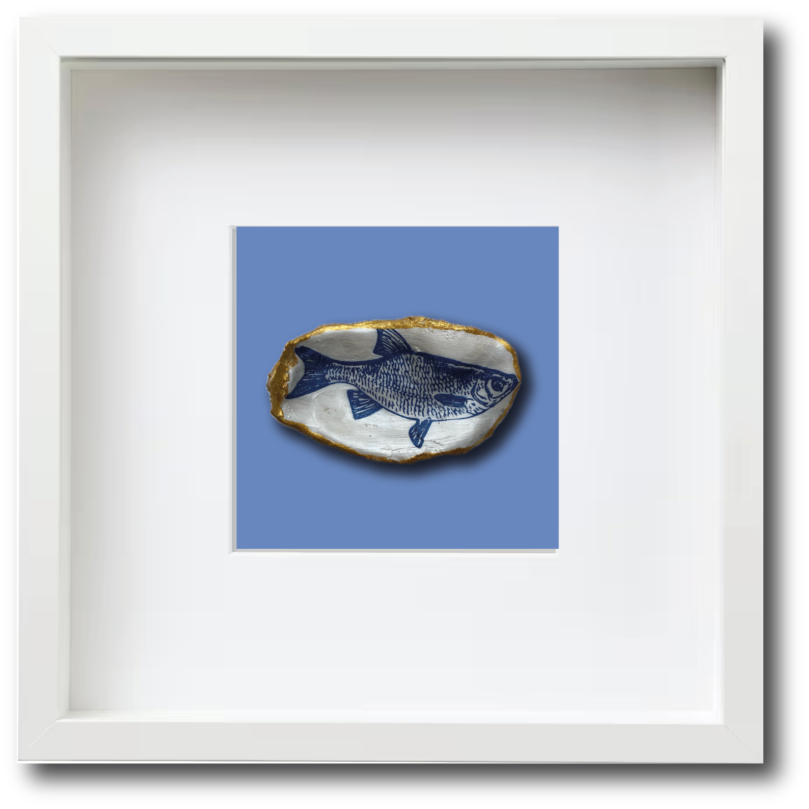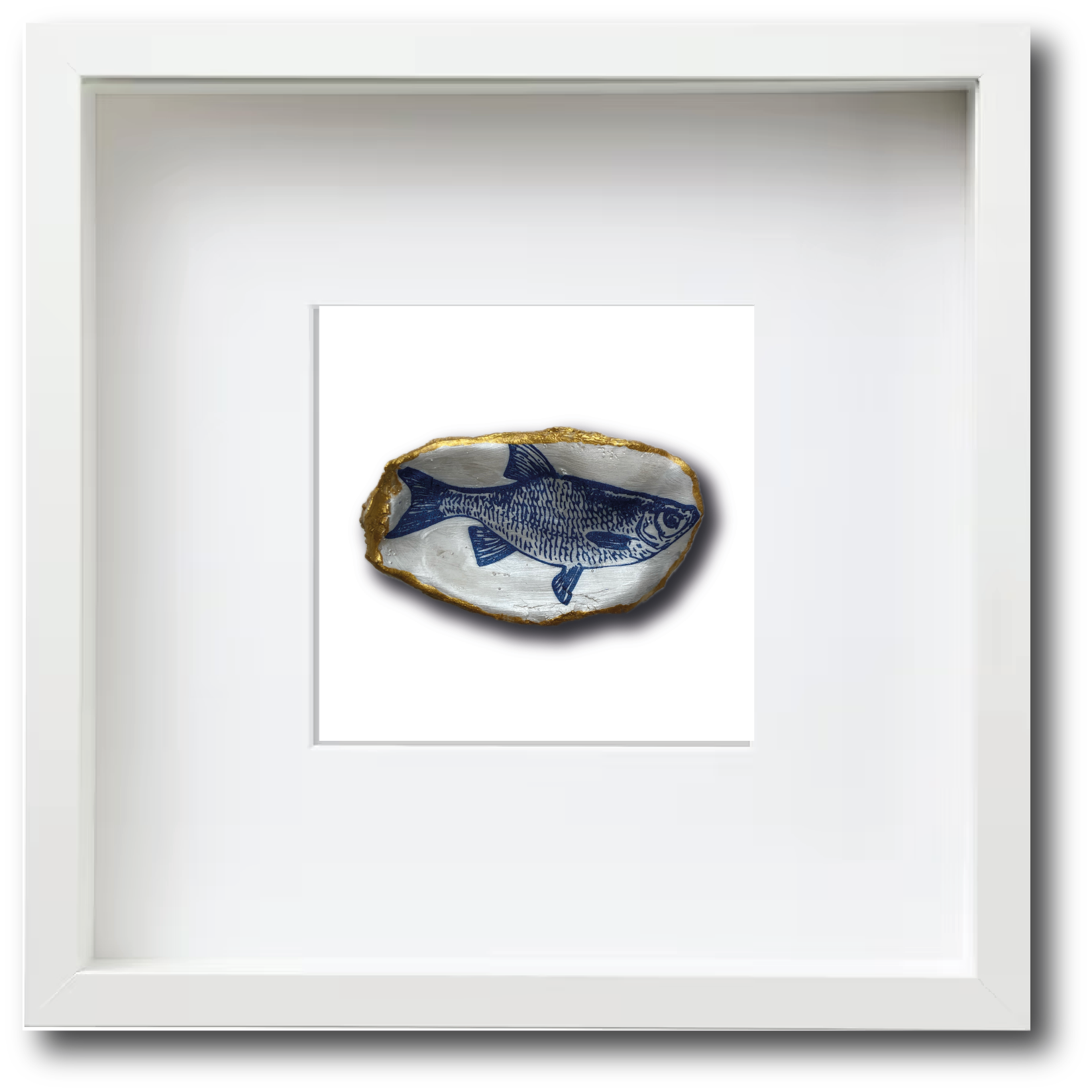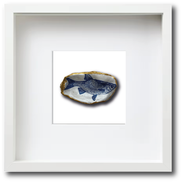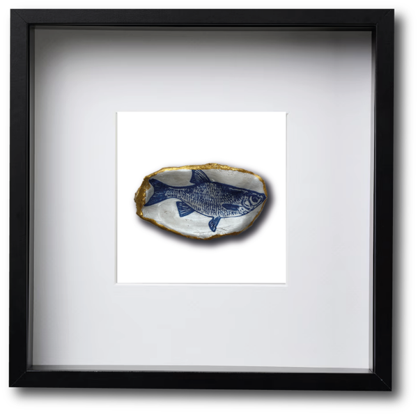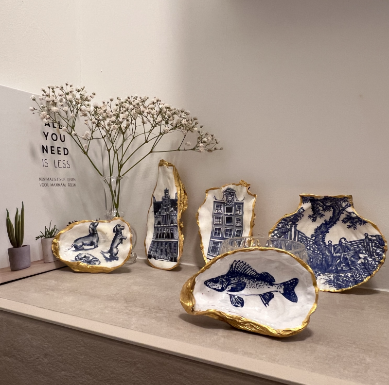 Deze met de hand gedecoreerde oesterschelp is geplukt in de Oosterschelde. Om de natuurlijke vormen van de oesterschelp te benadrukken hebben we de buitenkant en de rand beschilderd met goudverf. Als afbeelding hebben we een voorntje gebruikt in Delfts blauw.