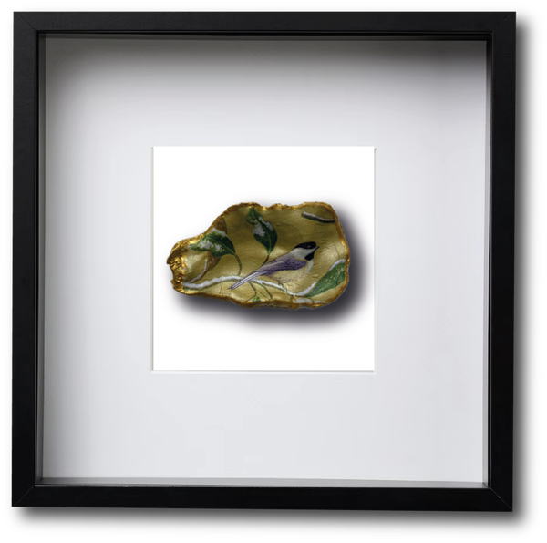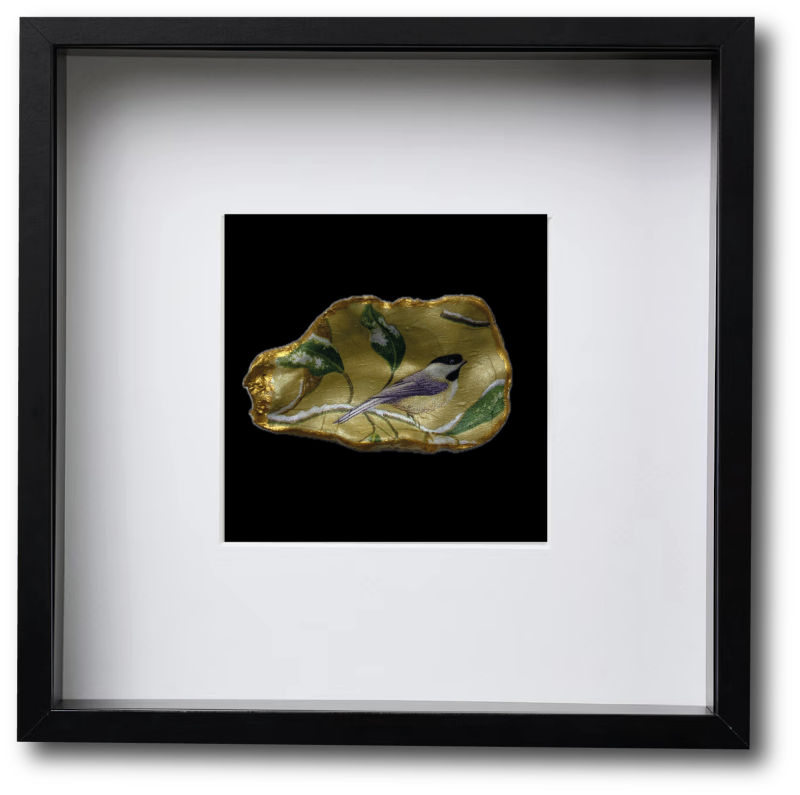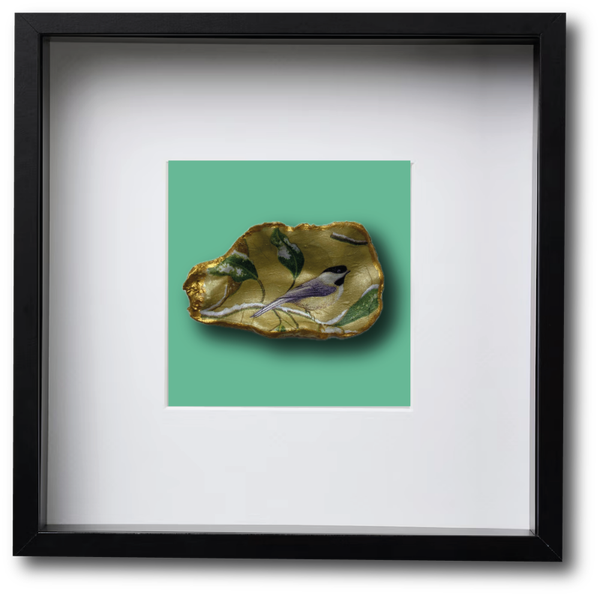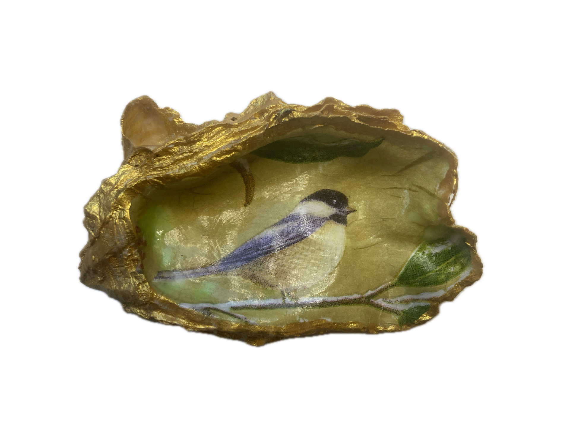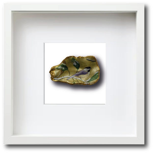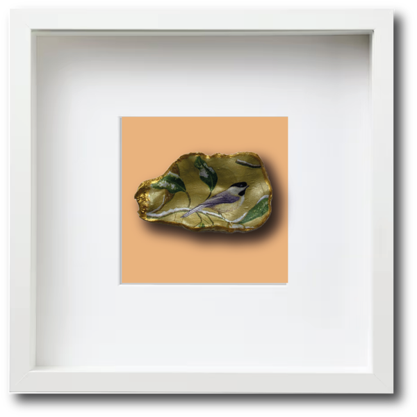 Deze Japanse oesterschelp hebben we geraapt in de Oosterschelde. Om de natuurlijke vormen te accentueren hebben we de buitenkant en de randen van de schelp met goudverf beschilderd. Als afbeelding hebben we de Chickadee of Amerikaanse Matkop gebruikt. Dit is de meest verbreide mees in Noord-Amerika. Mooi om naar te kijken en leuk als cadeau om te geven.