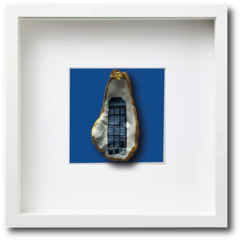 Deze grote Japanse oesterschelp hebben we geraapt in de Oosterschelde. Om de natuurlijke vormen te accentueren hebben we de buitenkant en de randen van de schelp met goudverf beschilderd. Als afbeelding hebben we een groot Amsterdams grachtenpand gebruikt. Mooi om naar te kijken als los exemplaar of in een schilderijlijst.