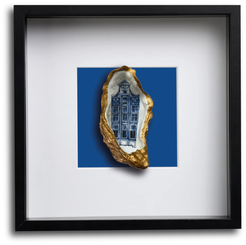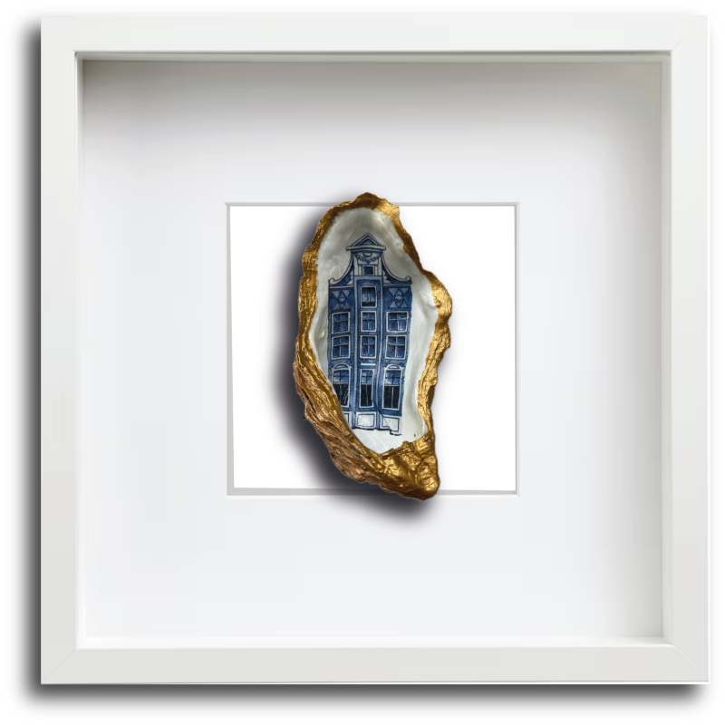 Deze grote Japanse oesterschelp hebben we geraapt in de Oosterschelde. Om de natuurlijke vormen te accentueren hebben we de buitenkant en de randen van de schelp met goudverf beschilderd. Als afbeelding hebben we een prachtig Amsterdams grachtenpand gebruikt. Mooi om naar te kijken als los exemplaar of in een schilderijlijst.