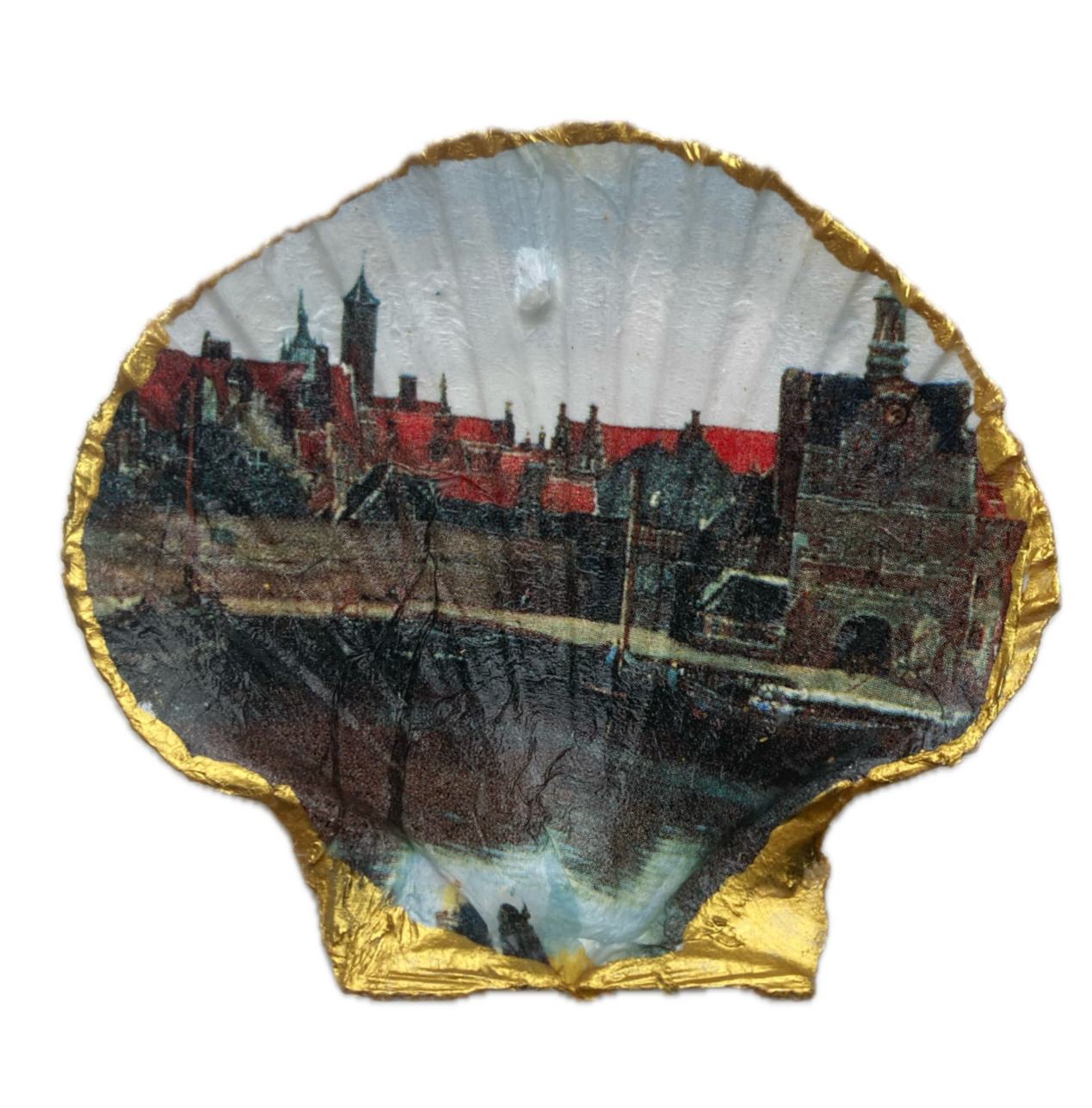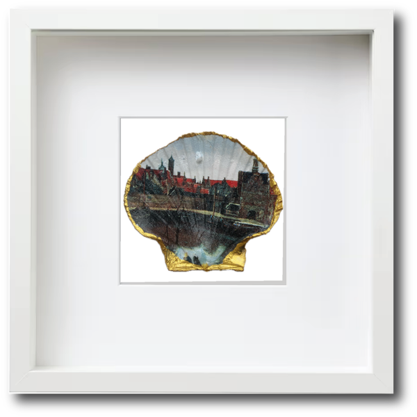 Gezicht op Delft is een van de bekendste schilderijen van de 17e-eeuwse Hollandse meester Johannes Vermeer. Het doek hangt in het Mauritshuis in Den Haag. Nu ook te koop op een St. Jacobsschelp en te bewonderen in je huiskamer.