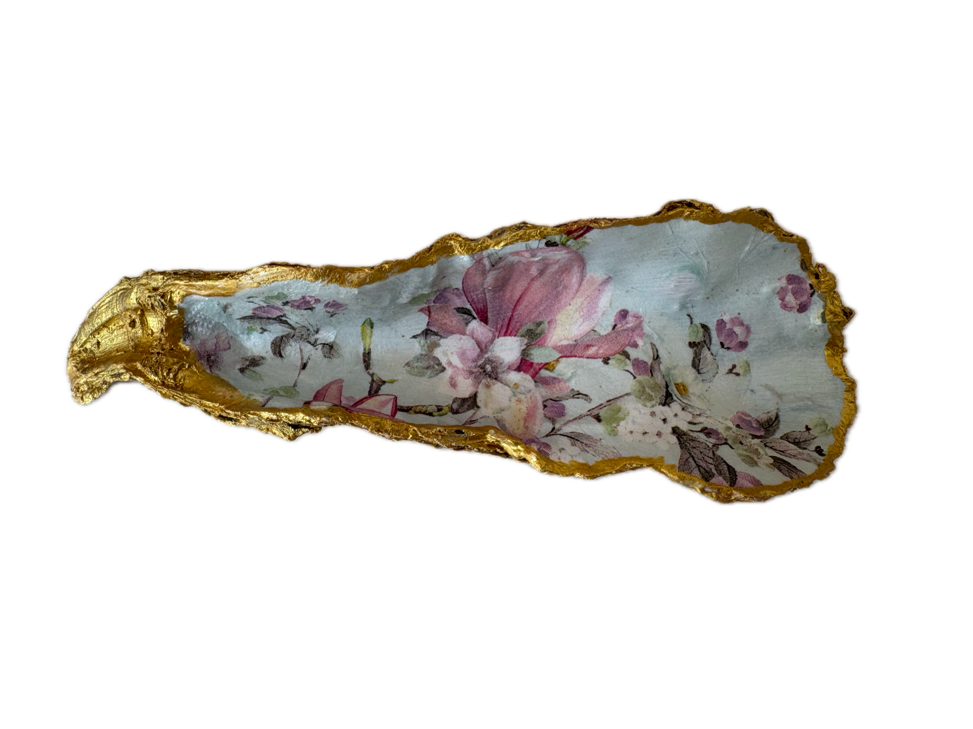 Deze oesterschelp komt ook uit de Oosterschelde. Wij hebben hem schoongemaakt en beschilderd met goudverf om de prachtige vormen te accentueren. Als decoratie hebben we gekozen voor een mooie romantische magnoliabloem.