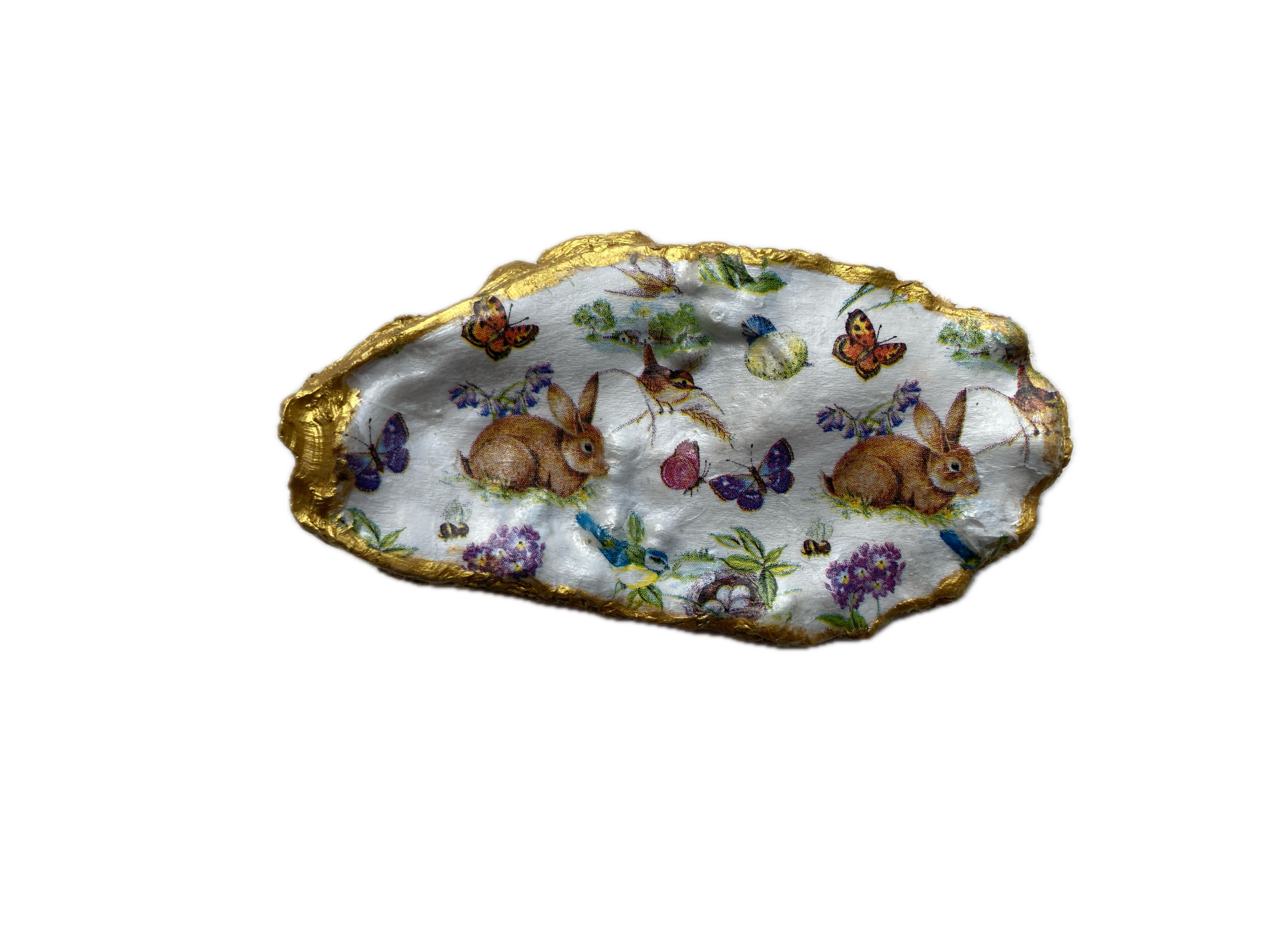 Deze oesterschelp hebben we met de decoupage techniek bekleed met een mooie Pasen decoratie. Met goudverf hebben we de natuurlijk vormen van de oesterschelp geaccentueerd. Je blijft er naar kijken als je deze oesterschelp in de hand houd. Haal de natuur in huis met deze mooie woningaccessoire.