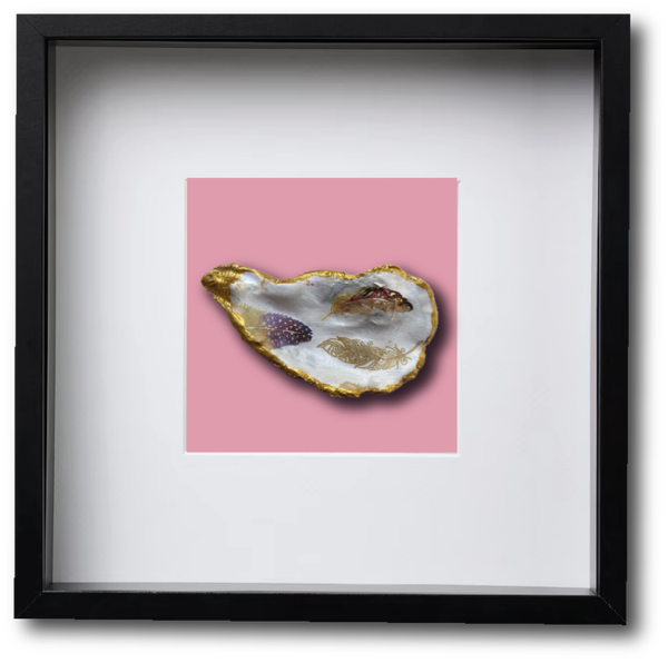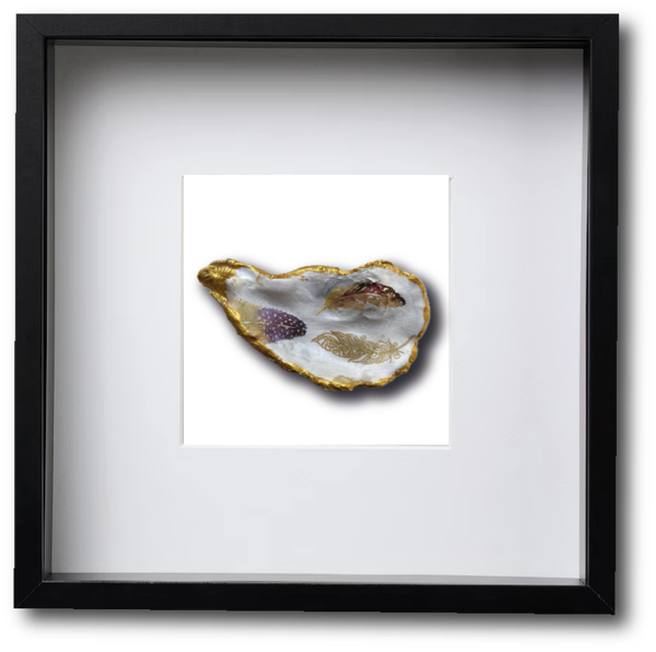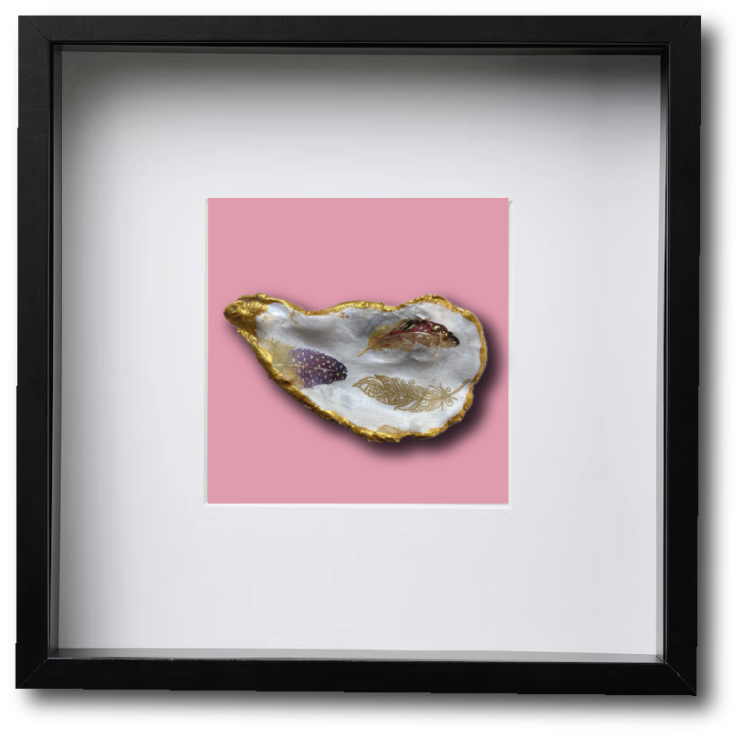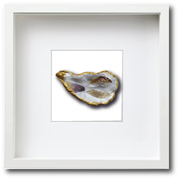 Deze Japanse oester hebben we geraapt in de Oosterschelde. Om de natuurlijke vormen van de oesterschelp te accentueren hebben we de achterkant en de randen met goudverf beschilderd. Op de binnenzijde van de oesterschelp hebben we een fantasie afbeelding met veren geplaatst. Een leuk en origineel cadeau vooral wanneer je het koopt met een schilderijlijst.