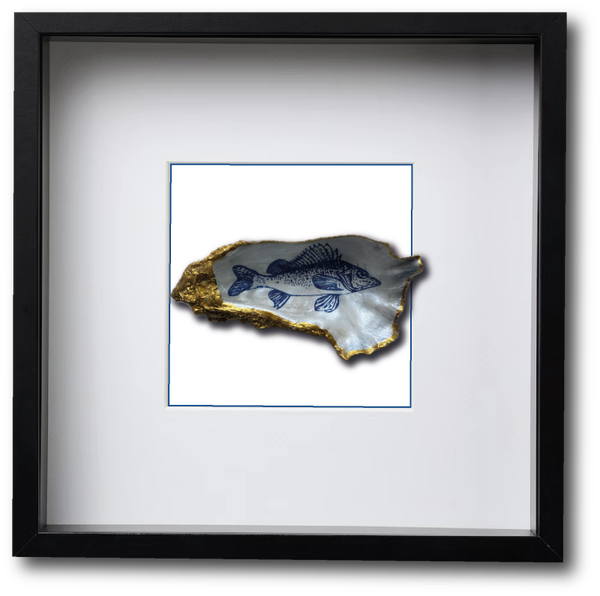 Deze met de hand gedecoreerde oesterschelp is geplukt in de Oosterschelde. Om de natuurlijke vormen van de oesterschelp te benadrukken hebben we de buitenkant en de rand beschilderd met goudverf. Als afbeelding hebben we een pos (familie van de snoekbaars) gebruikt in Delfts blauw.