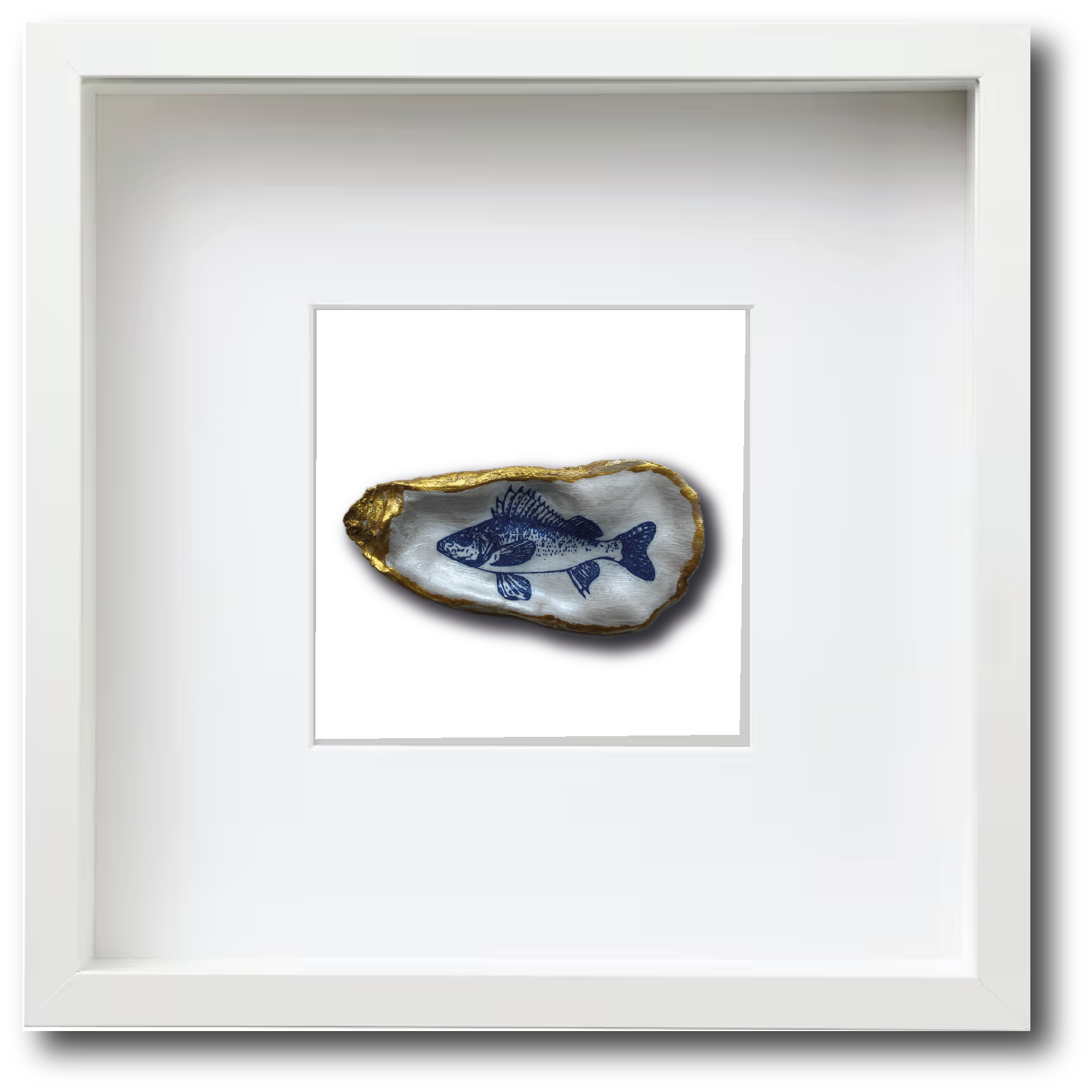 Deze met de hand gedecoreerde oesterschelp is geplukt in de Oosterschelde. Om de natuurlijke vormen van de oesterschelp te benadrukken hebben we de buitenkant en de rand beschilderd met goudverf. Als afbeelding hebben we een pos (familie van de snoekbaars) gebruikt in Delfts blauw.