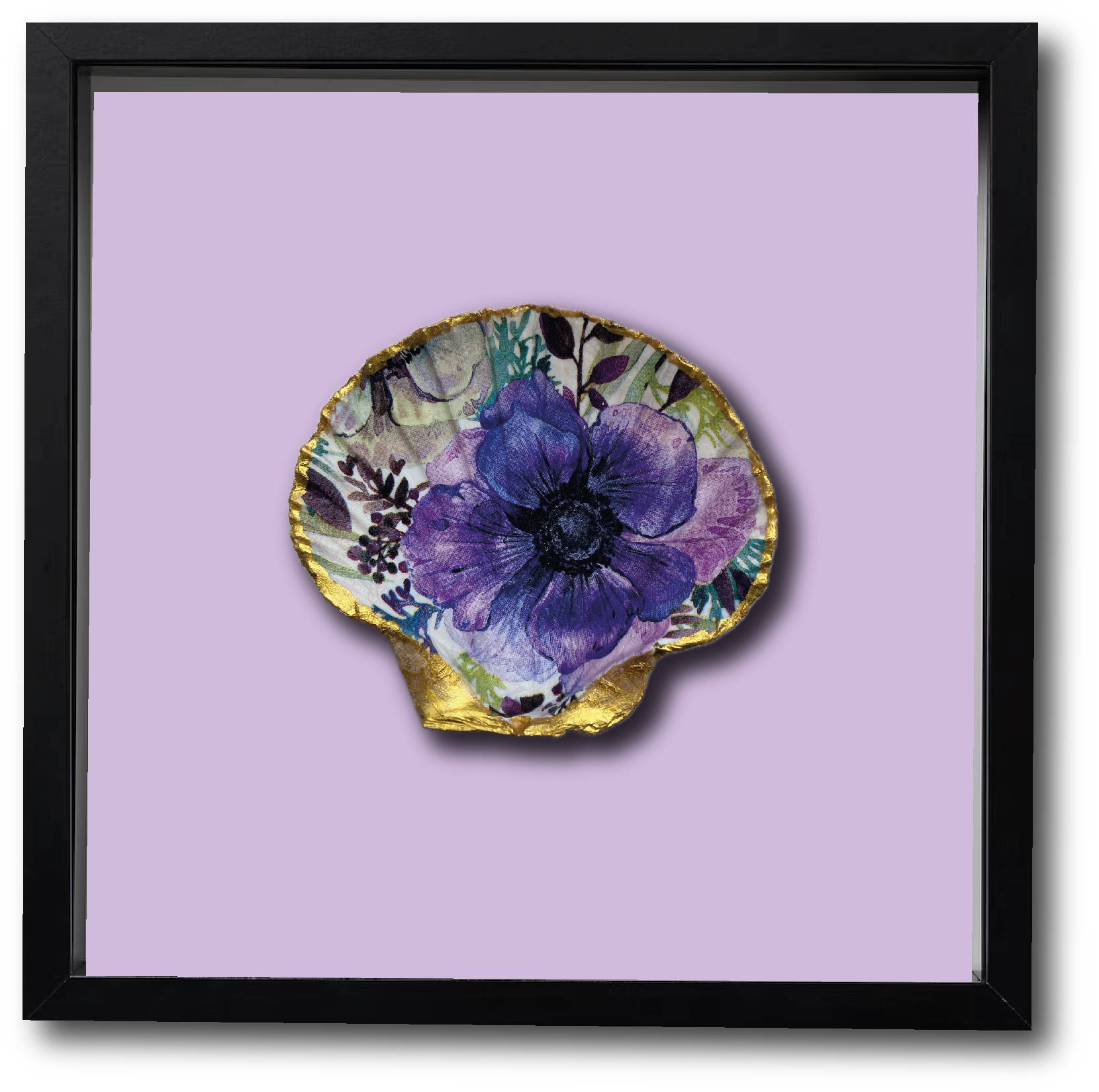 Deze St. Jacobsschelp hebben we gedecoreerd met een afbeelding van een groet paarse anemoon. De achterzijde van de schelp en de randen zijn beschilderd met goudverf.