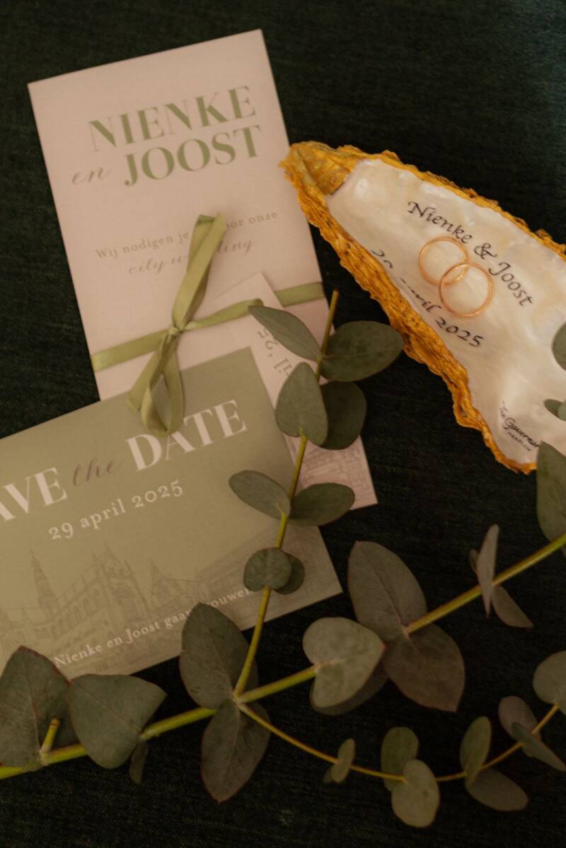 Om de huwelijksceremonie extra speciaal te maken kan een gepersonaliseerde oesterschelp gebruikt worden om de trouwringen in aan te bieden. De oester als symbool van de liefde.