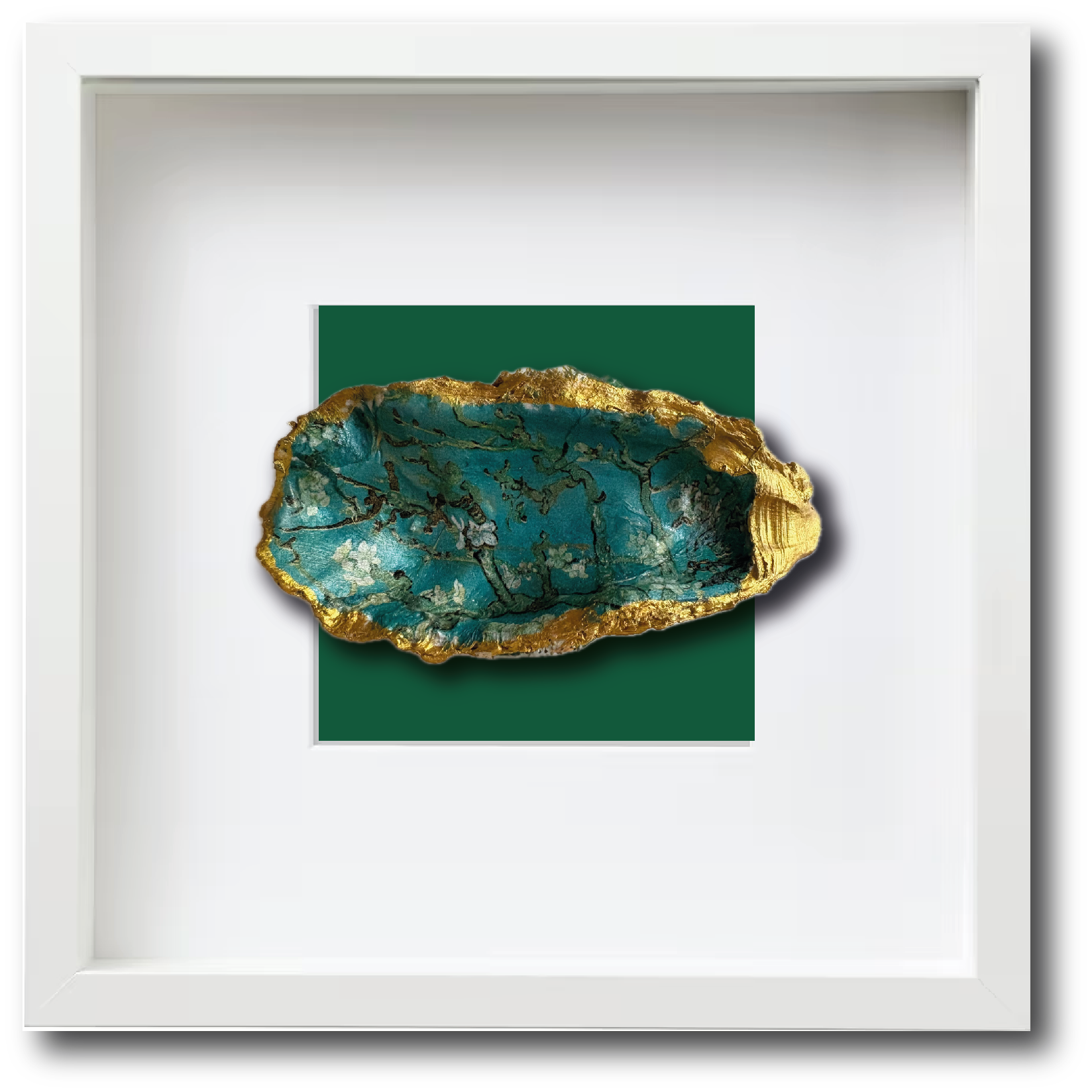 Deze XL oesterschelp hebben we geplukt in de Oosterschelde (in de buurt van Sas van Gent). We hebben hem gedecoreerd met een deel van de Amandelbloesem van Vincent van Gogh. Van Gogh schilderde dit als cadeau voor de geboorte van zijn neefje. Het is een van zijn lievelingsonderwerpen: grote bloeiende takken tegen een blauwe lucht. Te zien in het Van Gogh Museum in Amsterdam. Nu ook op een grote XLoesterschelp te koop en te bewonderen in je eigen woonkamer.