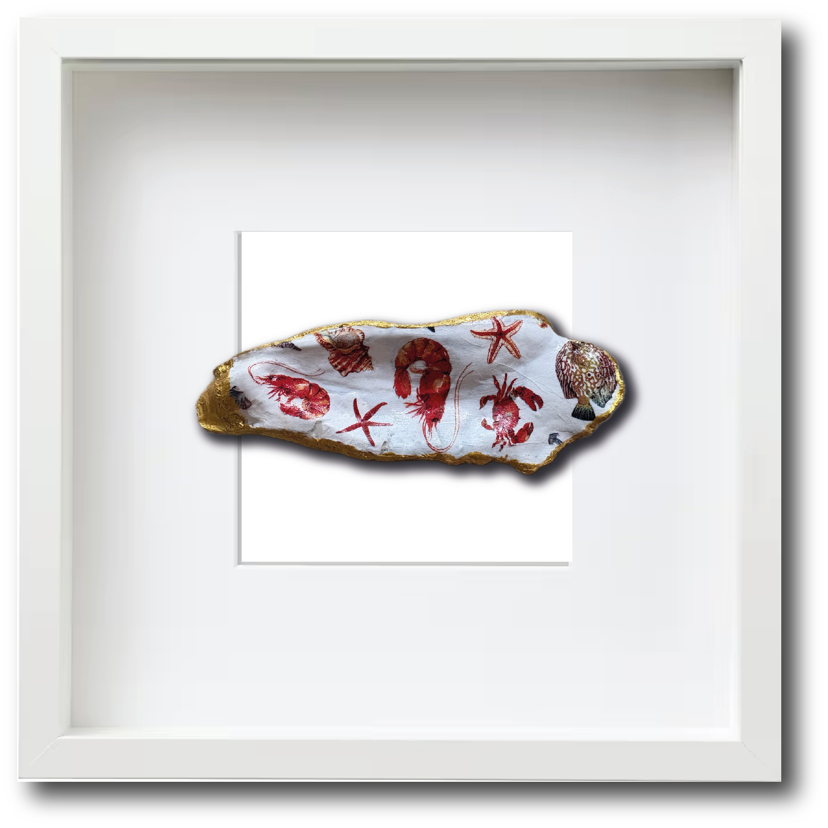 Deze mooie verzameling van garnaalen, krabbetjes en zeesterren hebben we aangebracht op een grote oesterschelp. De achterzijde van de schelp en de randen zijn beschilderd met goudverf en vervolgens is de decoratie afgelakt. Een prachtige decoratie in je woonkamer.