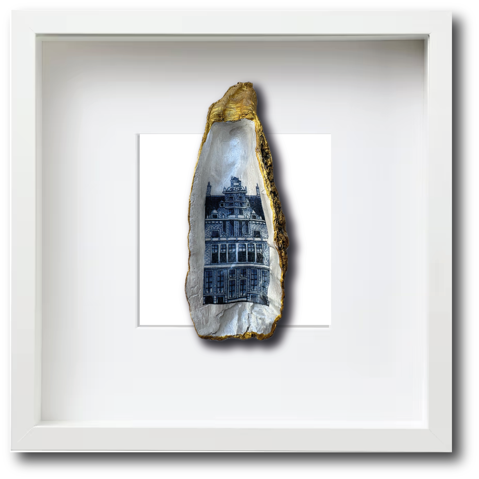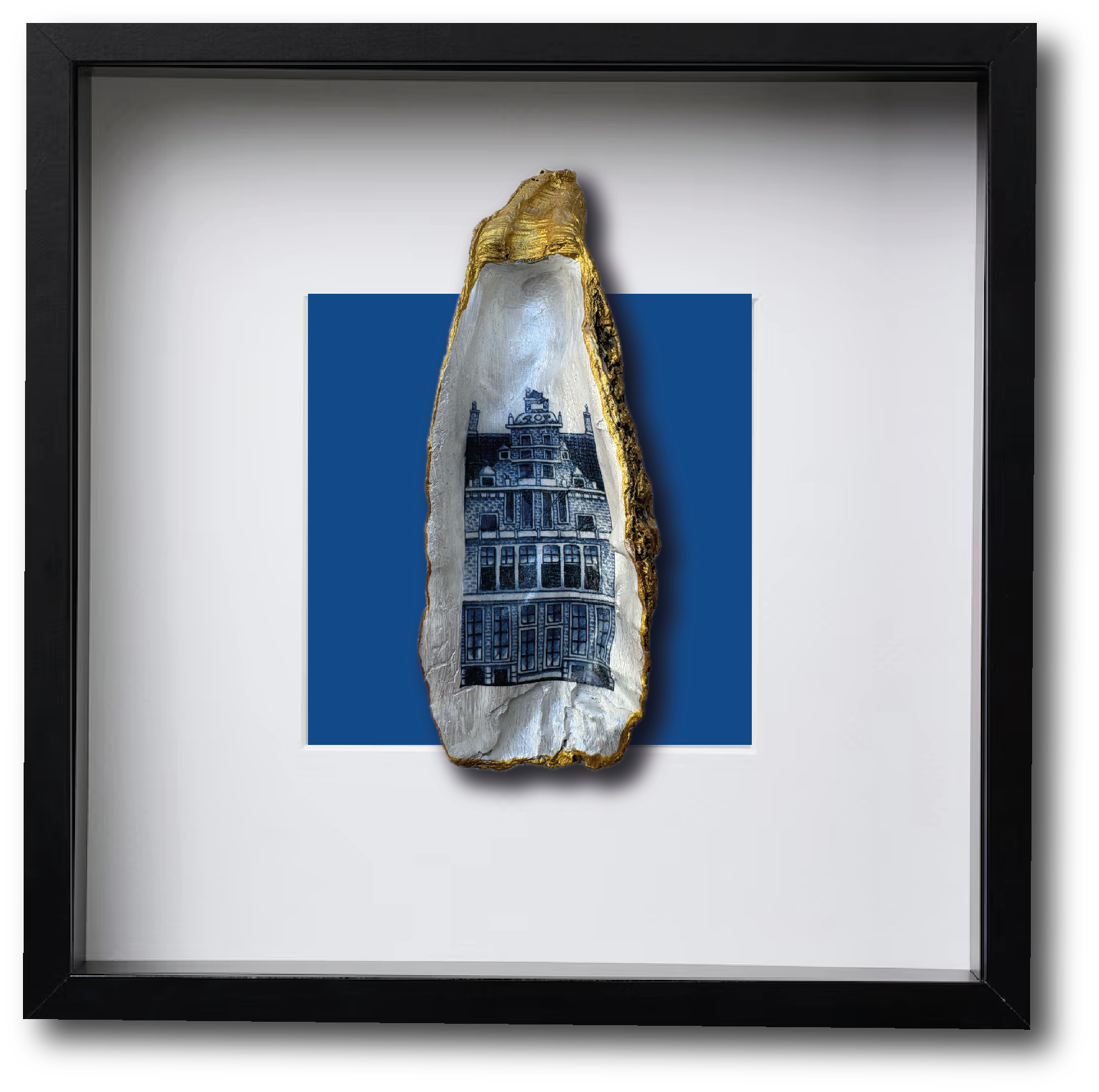 Deze grote Japanse oesterschelp hebben we geraapt in de Oosterschelde. Om de natuurlijke vormen te accentueren hebben we de buitenkant en de randen van de schelp met goudverf beschilderd. Als afbeelding hebben we een Amsterdams grachtenpandje gebruikt. Mooi om naar te kijken als los exemplaar of in een schilderijlijst.