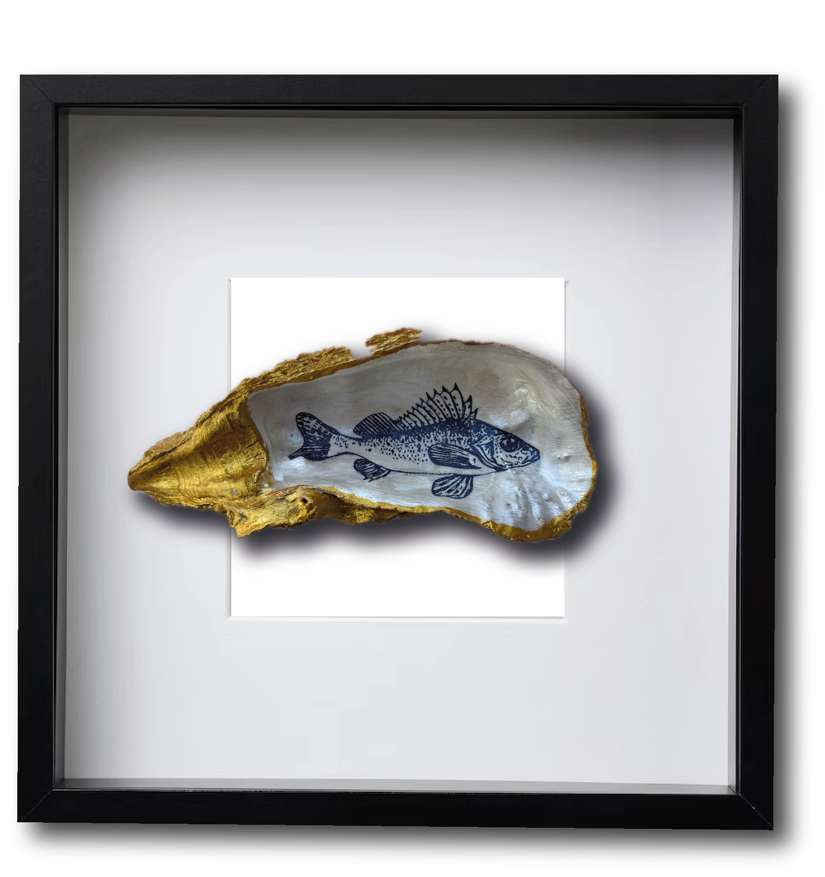 Deze met de hand gedecoreerde oesterschelp is geplukt in de Oosterschelde. Om de natuurlijke vormen van de oesterschelp te benadrukken hebben we de buitenkant en de rand beschilderd met goudverf. Als afbeelding hebben we een pos (familie van de snoekbaars) gebruikt in Delfts blauw.