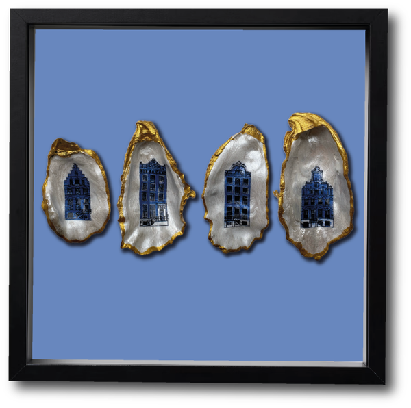 We hebben hier 4 kleine oesterschelpen gebruikt met grachtenpanden van de Keizersgracht in Amsterdam. De tekeningen staan in het Grachtenboek zoals door Caspar Philips Jacobszoon getekend in 1768-1771.