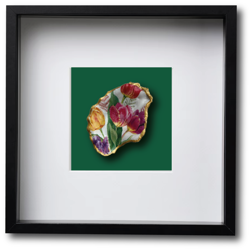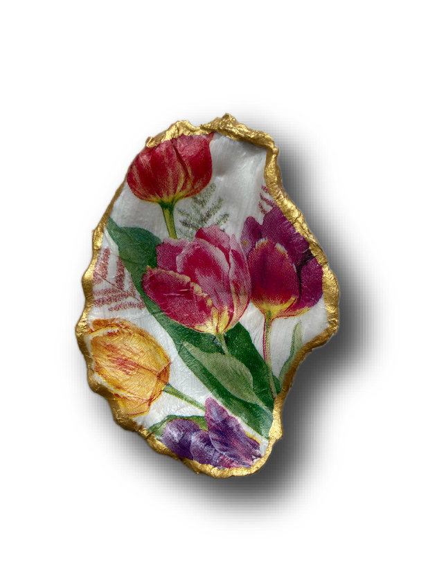 Deze oesterschelpen zijn met zorg geselecteerd en schoongemaakt. Vervolgens gedecoreerd met een bloemmotief en daarna afgewerkt met een gouden rand en een gouden achterzijde. Als laatste is de oesterschelp afgelakt.