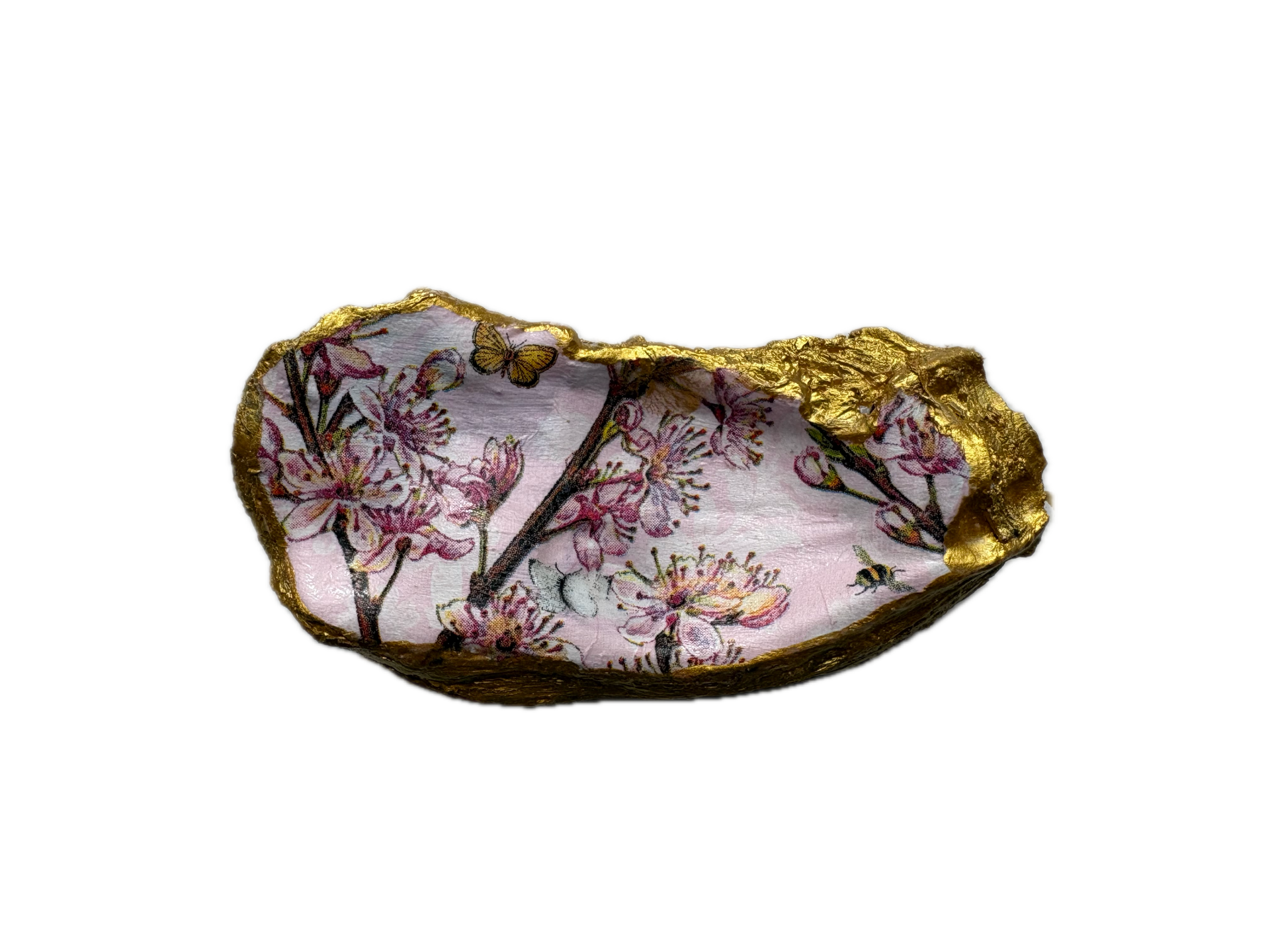 De roze bloesem op deze oesterschelp brengt de lente in de woonkamer. De met de hand gedecoreerde oesterschelp is beschilderd met goudverf om de vormen van de oesterschelp extra te accentueren.