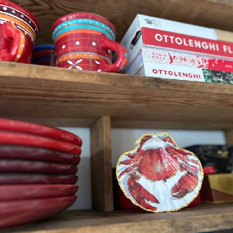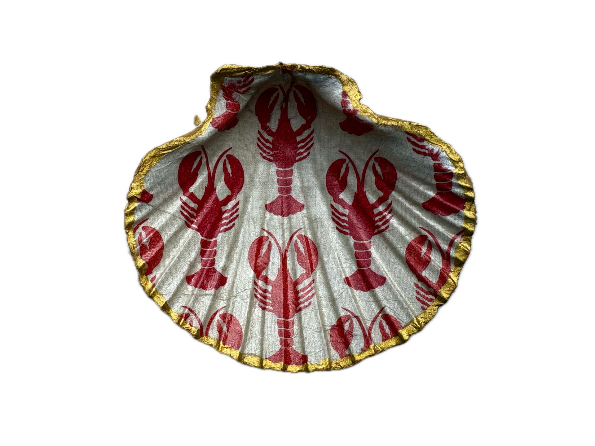 Deze St. Jacobsschelp hebben we gedecoreerd met een afbeelding van rode krabben. De achterzijde van de schelp en de randen zijn beschilderd met goudverf.